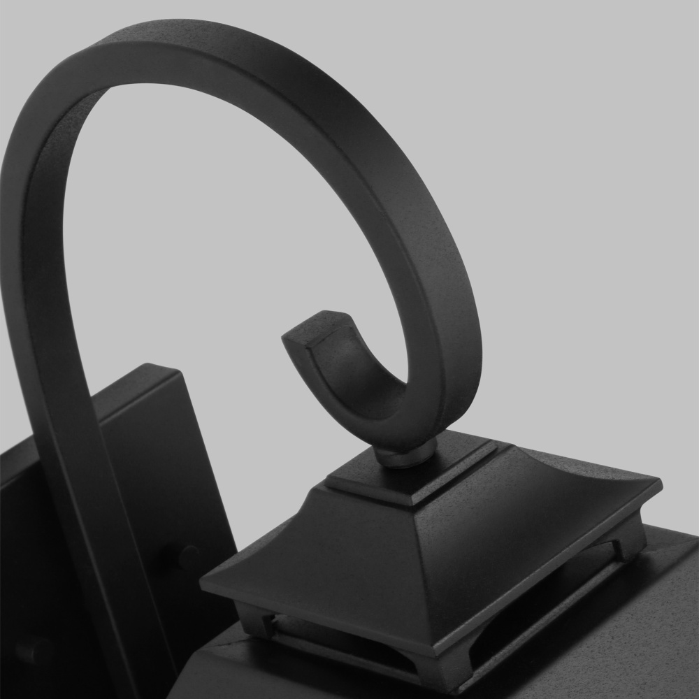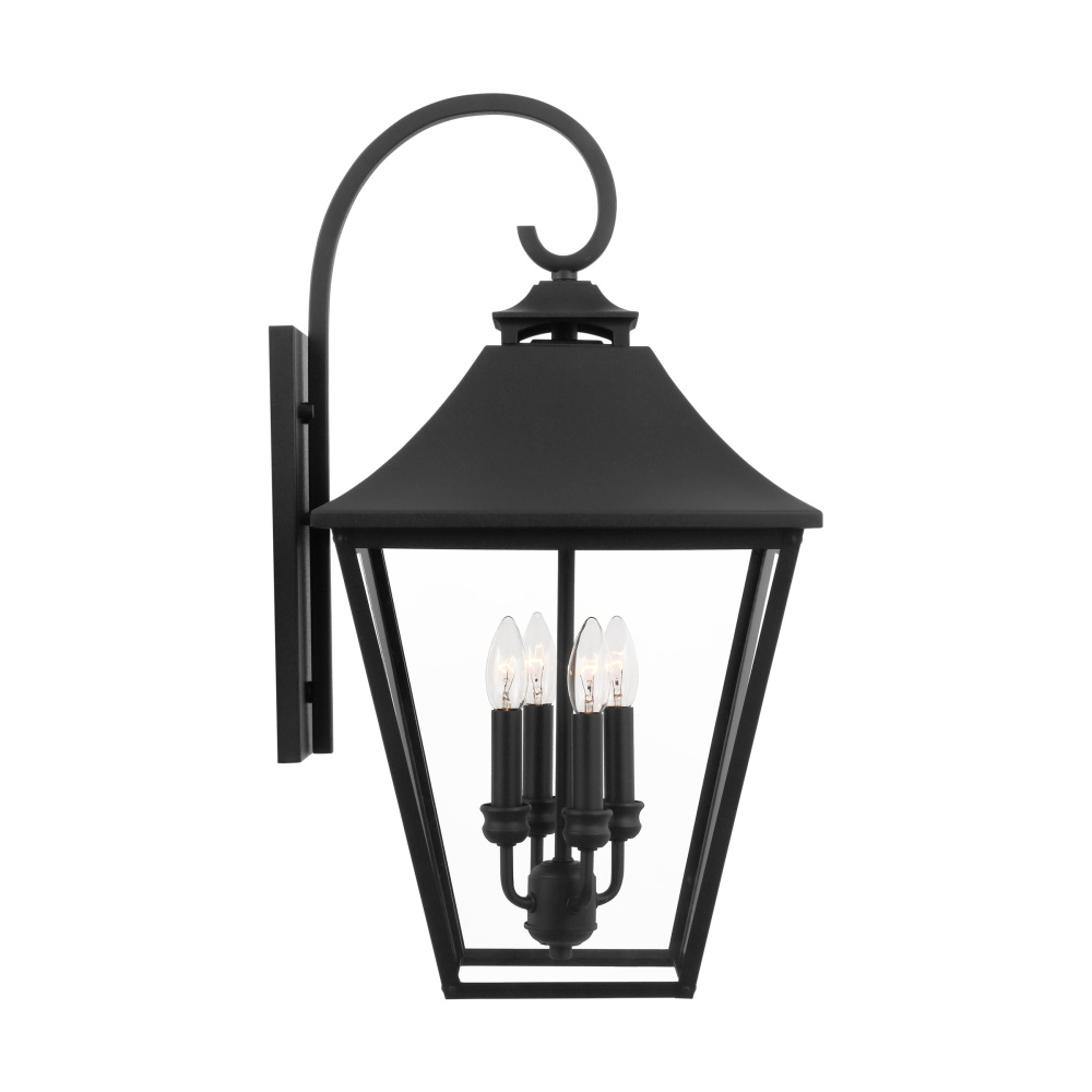 Designed by Sean Lavin, the Galena four light outdoor wall fixture in textured black enhances the beauty of your property, makes your home safer and more secure, and increases the number of pleasurable hours you spend outdoors. Galena is a Europe-inspired classic lantern. Simple and refined, Galena features a gently curved hook detail atop a vented, square-off roofline and candle tubes floating within the tapered clear glass shades. Galena is a warm, welcoming silhouette offered in a Sable or Textured Black finish.