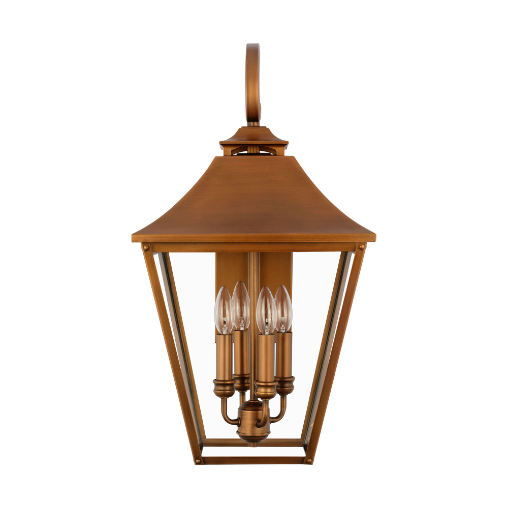 The Galena outdoor series by Sean Lavin is a Europe-inspired classic lantern. Simple and refined, Galena features a gently curved hook detail atop a vented, square-off roofline and candle tubes floating within the tapered Clear glass shades. Galena is a warm, welcoming silhouette offered in a Natural Copper, Sable or Textured Black finish.