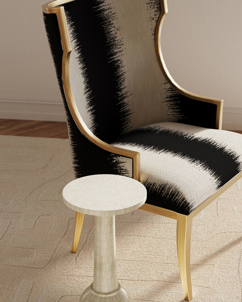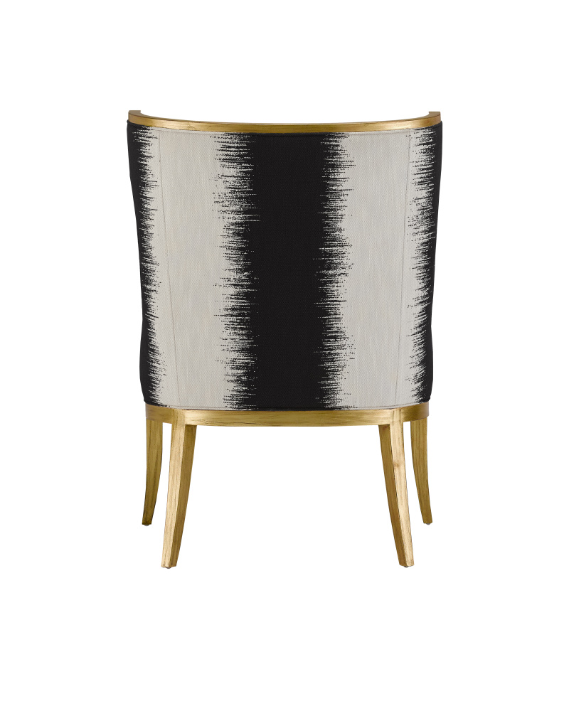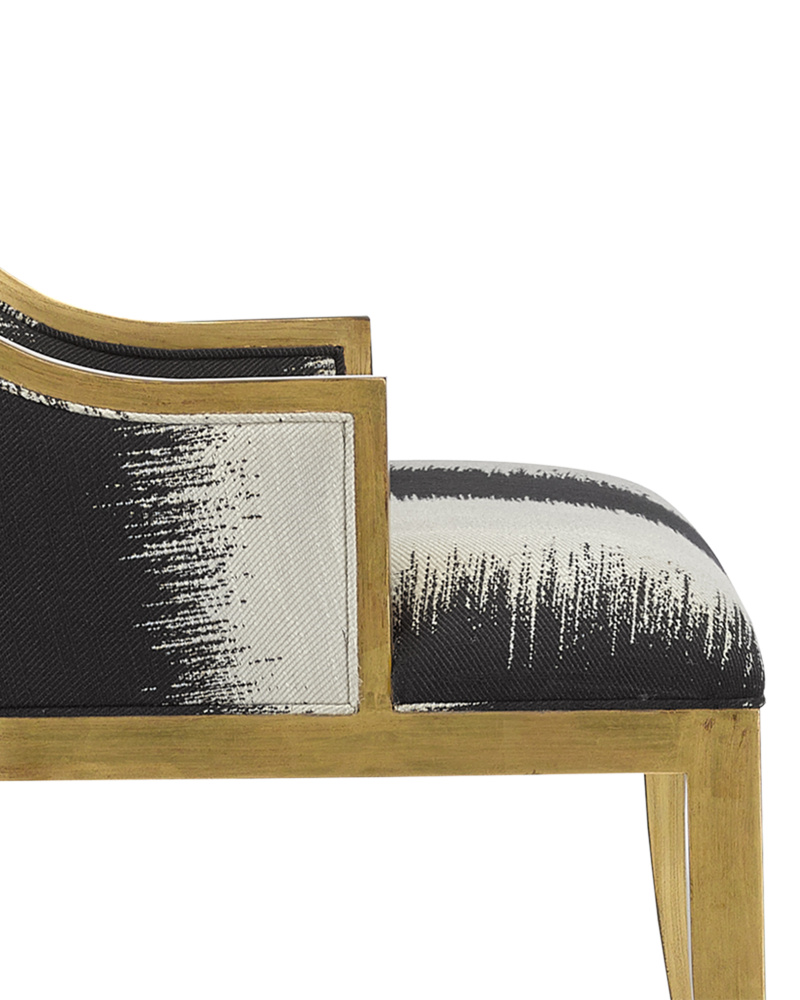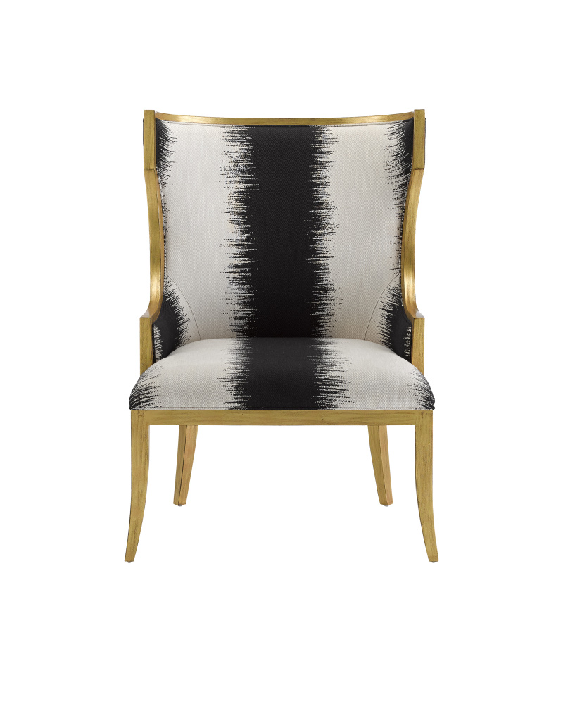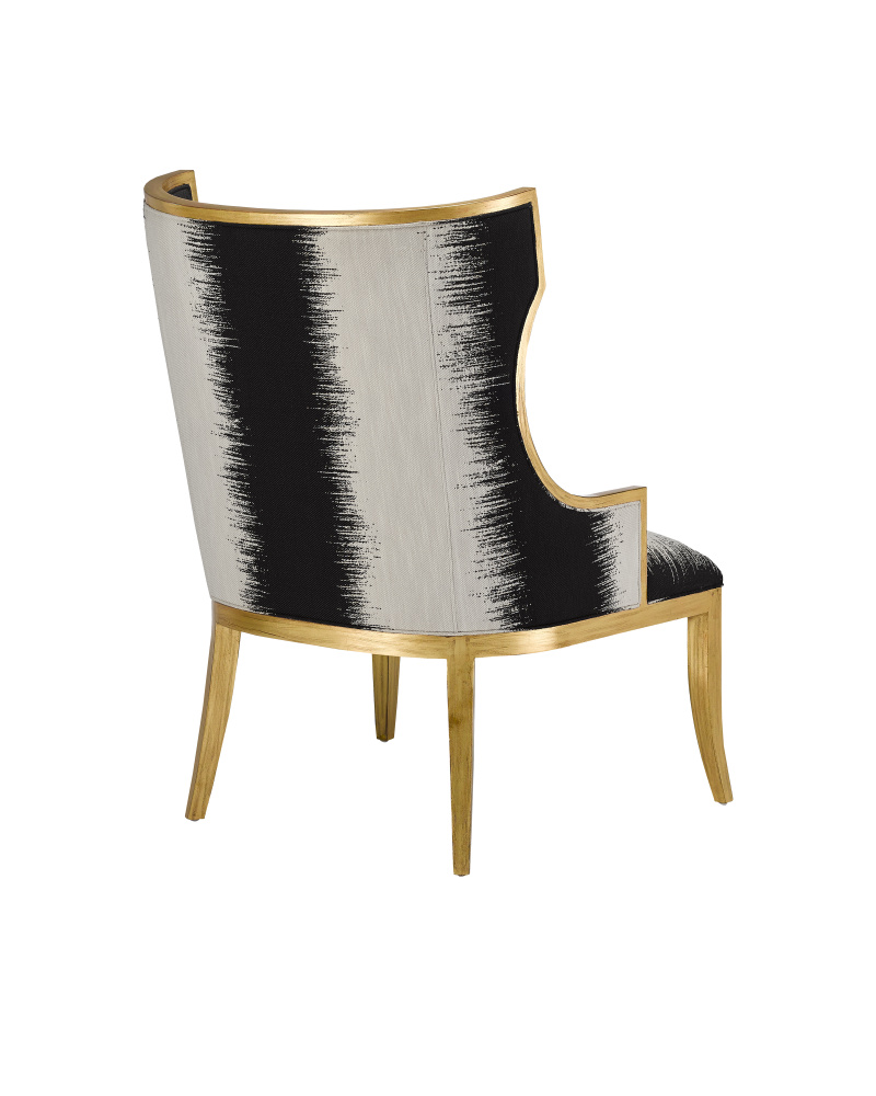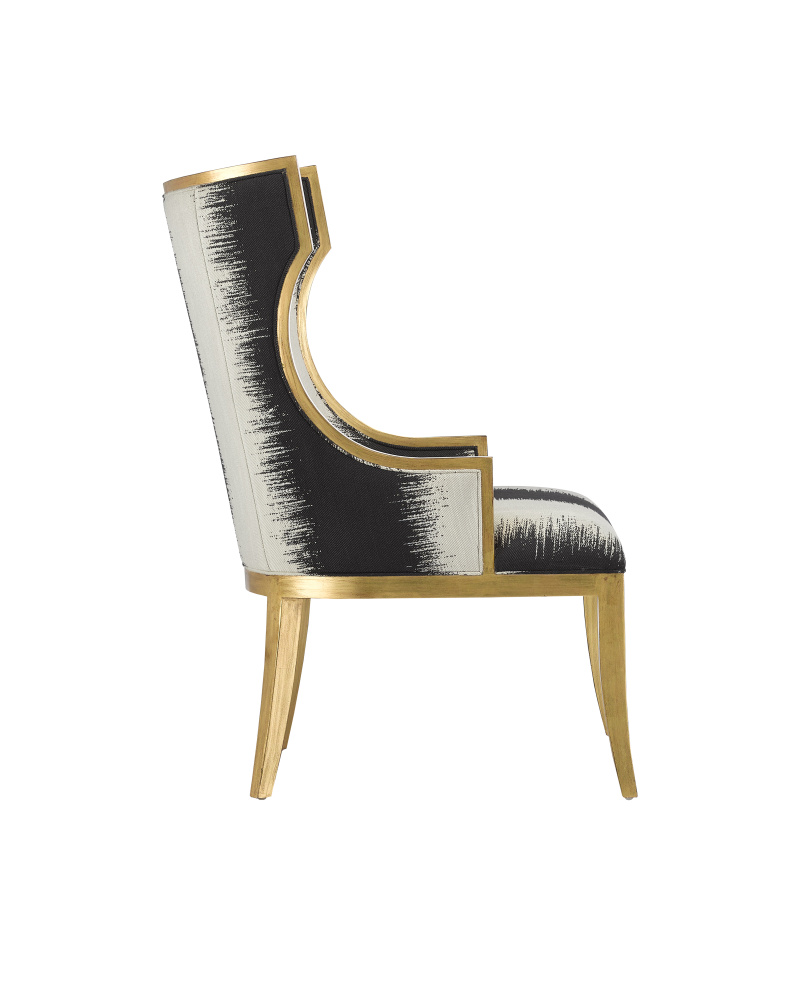 Chic, comfortable, and timeless, the Garson Gold Armchair is an updated take on the classic wingback design. The frame is made of mahogany with an antique gold finish. The black and white chair is upholstered in an Otunga Kona fabric.
