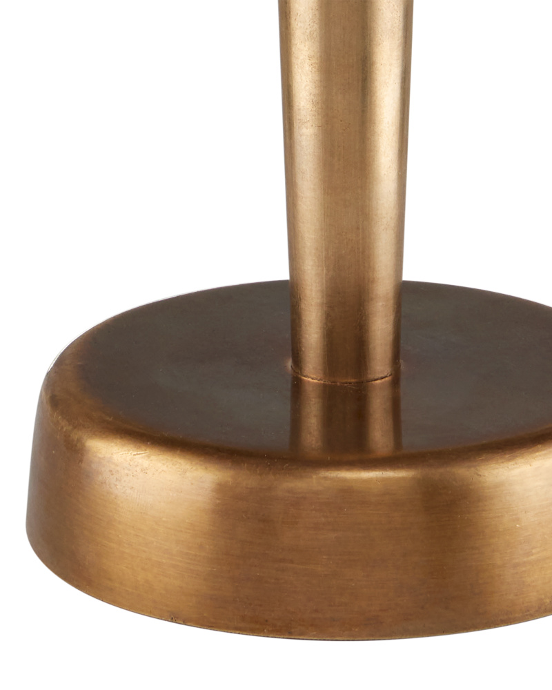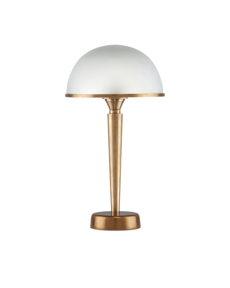 The Gatsby Table Lamp is a time-honored design that was ubiquitous during the heyday of the jazz age. The base, telescoping stem, and rim that holds the frosted glass shade in place are luminous in a warm antique brass finish. The profile is an exemplar of Americana with hints of the Art Deco style popular in Paris during the Roaring '20s.