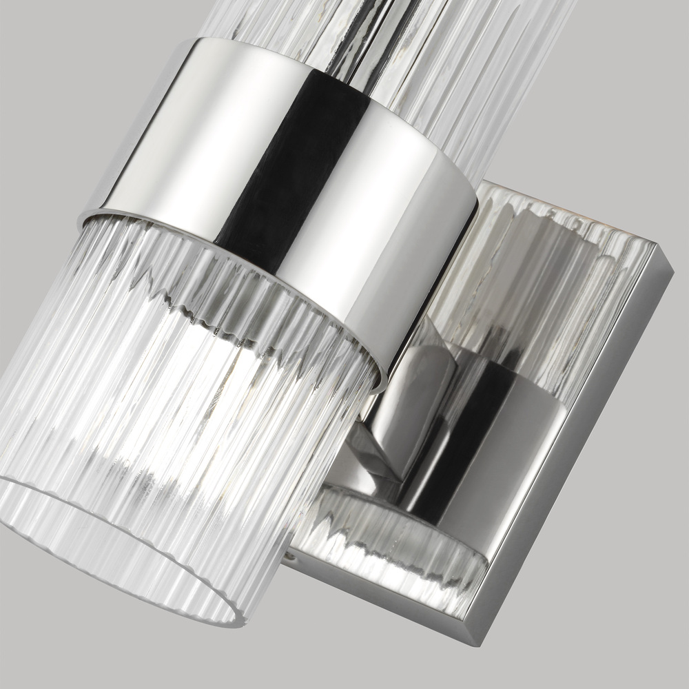 In the Geneva one light sconce, a slender, fluted shade forms an elegant, dynamic silhouette that's balanced by a strong frame of Burnished Brass or Polished Nickel.