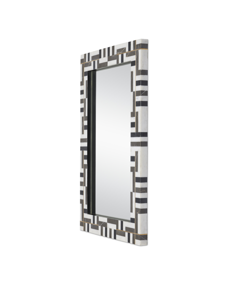For spaces that will welcome bold geometric patterns, the Gentry Rectangular Mirror will be right at home. The shapes that make up the pattern are fashioned from three different types of marble: Ambaji, Marquina, and Pietra Gray. Bringing a hint of brightness to the composition is the brass inlay that intersects on some edges where the marble pieces meet; the fact that they do so in a random composition adds interest to the black and white mirror. The inside edge of the frame where it intersects with the glass is black. There are two cleats on the mirror so it can be hung vertically or horizontally.