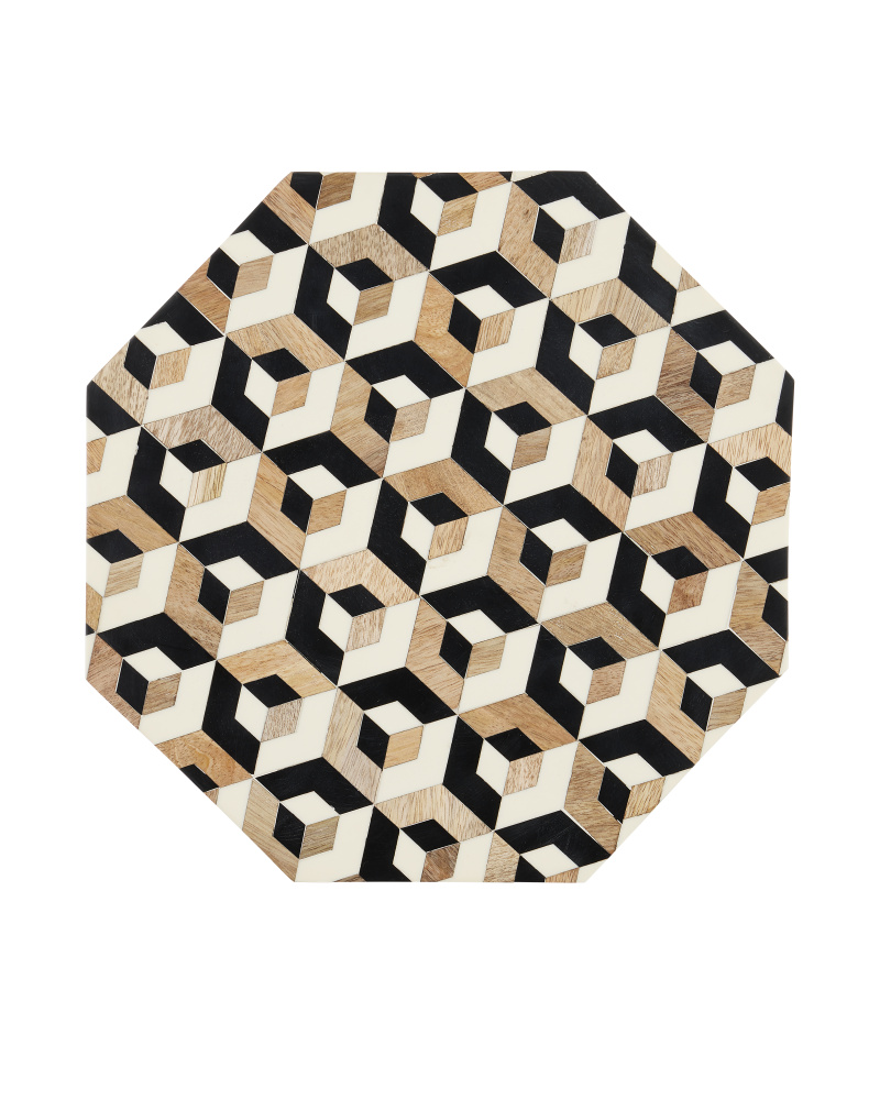 Made of mango wood, the Geo Accent Table is covered in pieces of natural mango wood, white bone, and black composite in an octagonal multi-colored pattern. Each piece of the complex puzzle is cut and applied by hand, making this a painstaking piece to realize. The pattern flows all the way to the floor and the tan accent table is a hexagon shape that will add interest to its spot in a room.