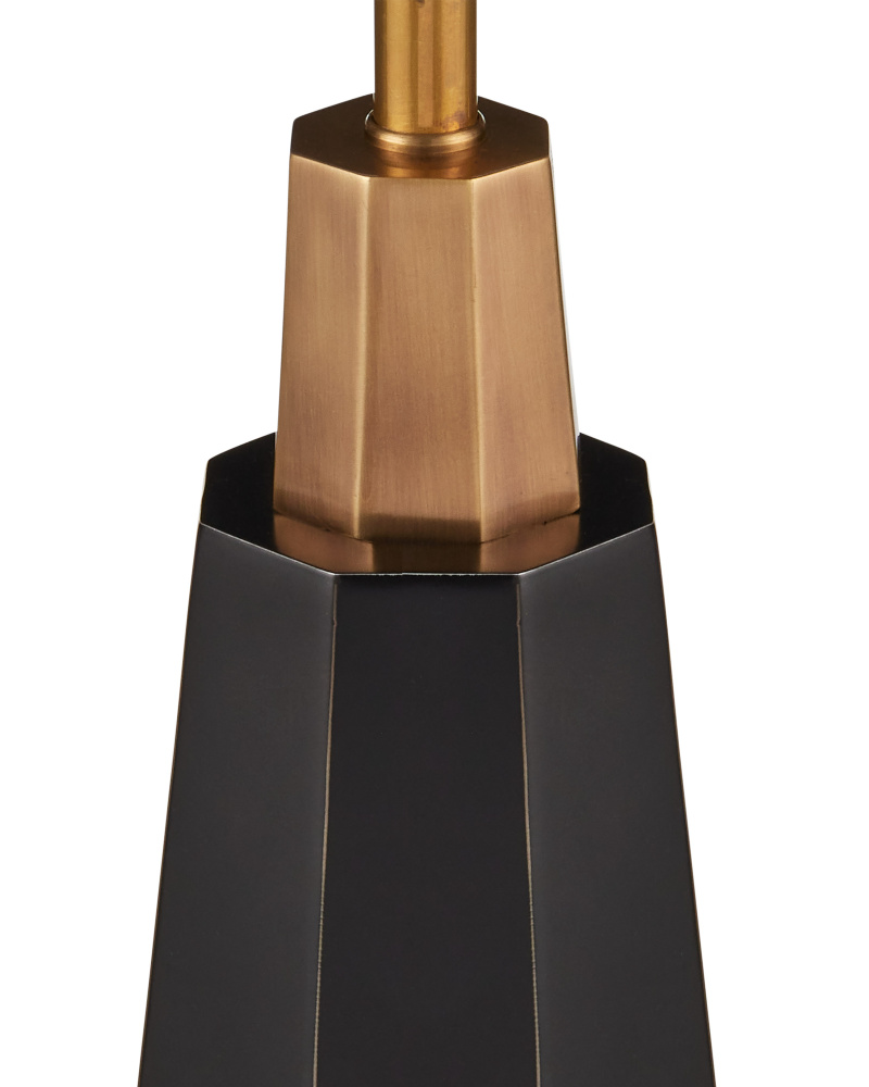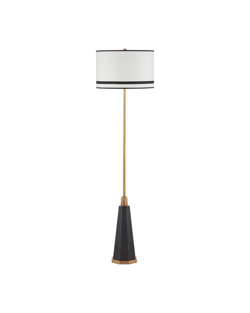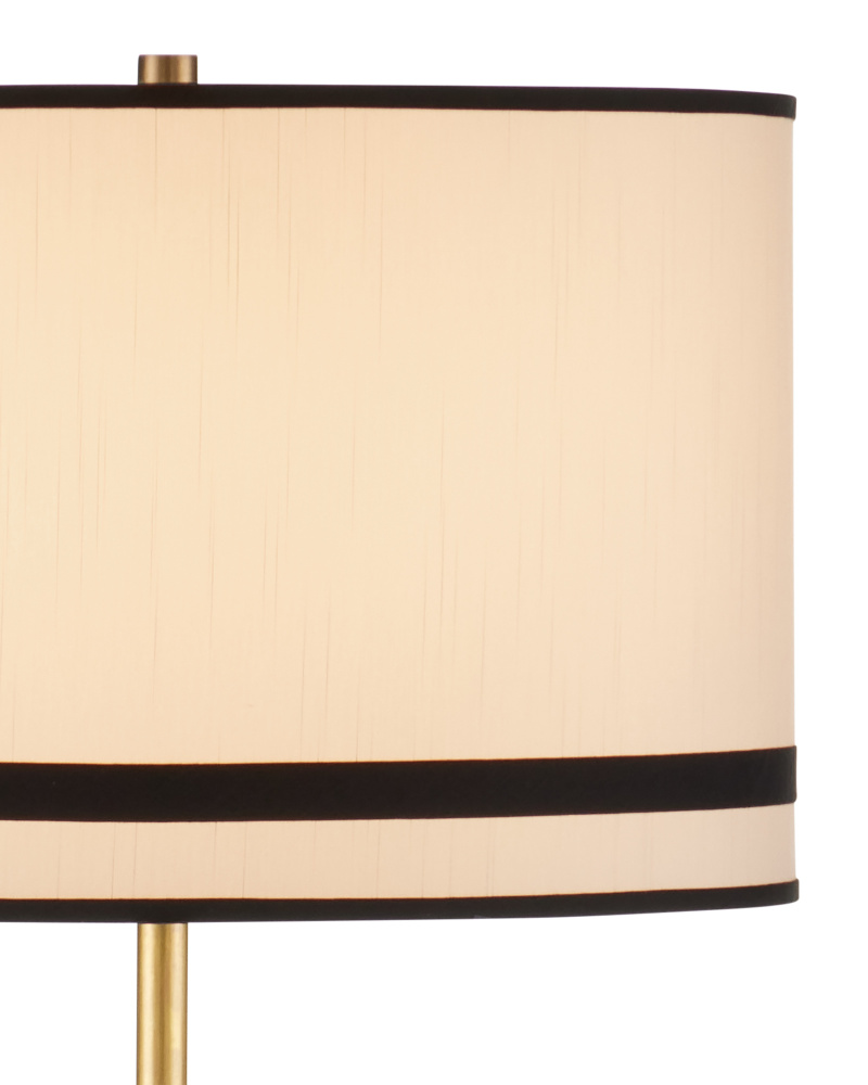 The Gieves Floor Lamp is supported by a telescoping pedestal crafted from metal in a bronze finish that sits atop a fluted base in an antique brass finish. The thin stem that extends toward the shade matches the base, while the trim on the black tie-striped shade matches the flaring triangular shape at the bottom.