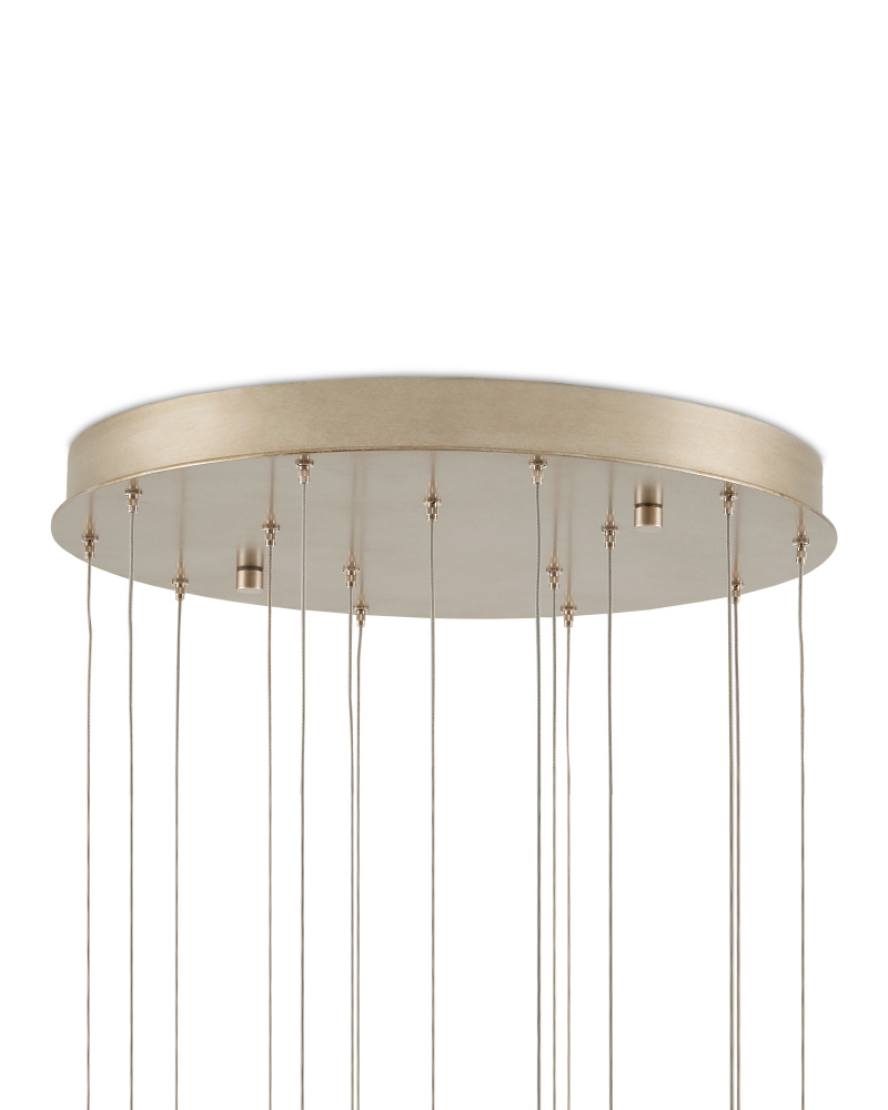 Our Giro Round 15-Light Multi-Drop Pendant has metal shades that are pierced by hand; the textural globes in a mix of painted silver and nickel finishes on point for modern farmhouse interiors. Small blue beads placed in some of the piercings add a lovely color to the silver pendant as light strikes them. The canopy of this piece is luminous in a painted silver finish. This fixture is among Currey & Company's multi-drop pendant collection, which includes multiple configurations.