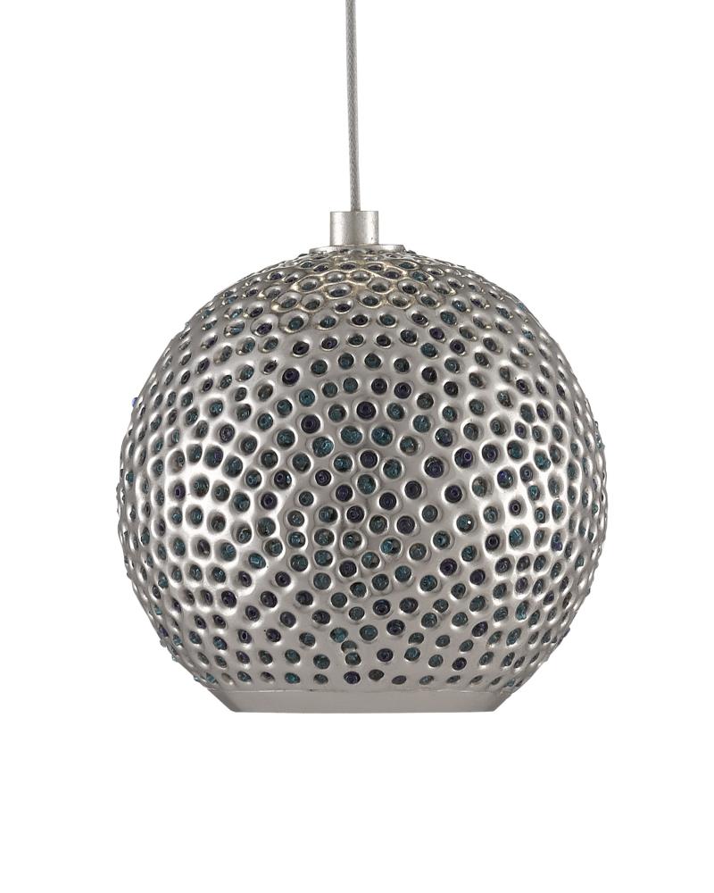 The Giro Rectangular 7-Light Multi-Drop Pendant has metal shades that are pierced by hand to create textural globes in a mix of painted silver and nickel finishes that are on point for modern farmhouse interiors. Small blue beads placed in some of the piercings add a lovely color to the silver pendant as light strikes them. The canopy of this piece is luminous in a painted silver finish. This fixture is among Currey & Company's multi-drop pendant collection, which includes multiple configurations.