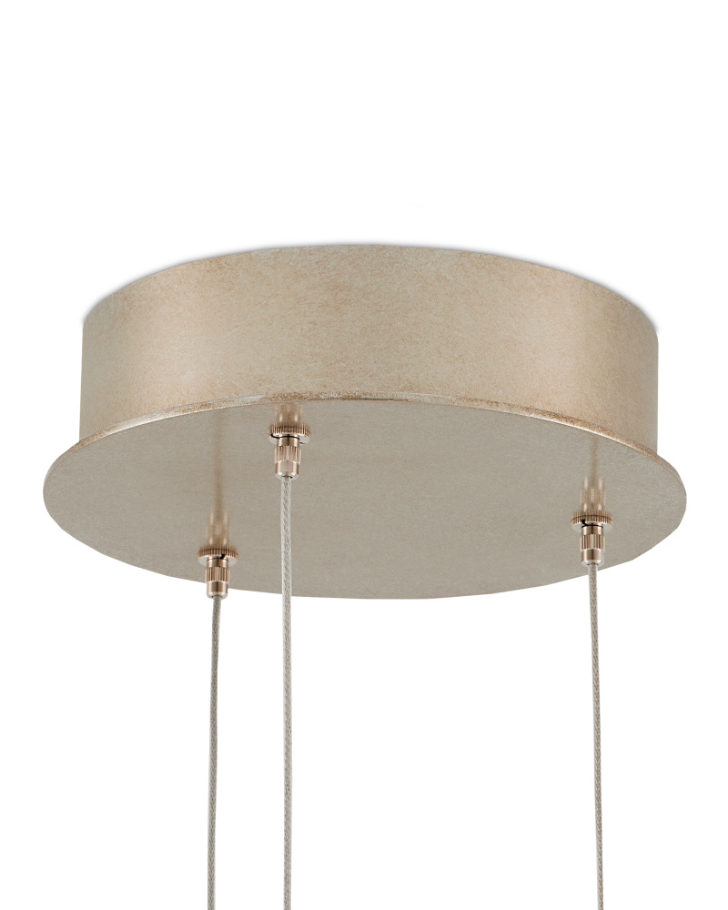 The faceted shades of the Glace White Round 3-Light Multi-Drop Pendant are made of panes of white art glass joined with seams of metal in an antique brass finish. The organic shape of the shades and the fact they hang at differing heights enhance the personality of this white pendant, which will ornament a space like a piece of jewelry. Art glass is one of the most artisanal materials that can be used, as its swirling opaque surface creates a milky glow whether lights are switched on or not. The canopy of this piece is luminous in a painted silver finish. This fixture is among Currey & Company's multi-drop pendant collection, which includes multiple configurations.