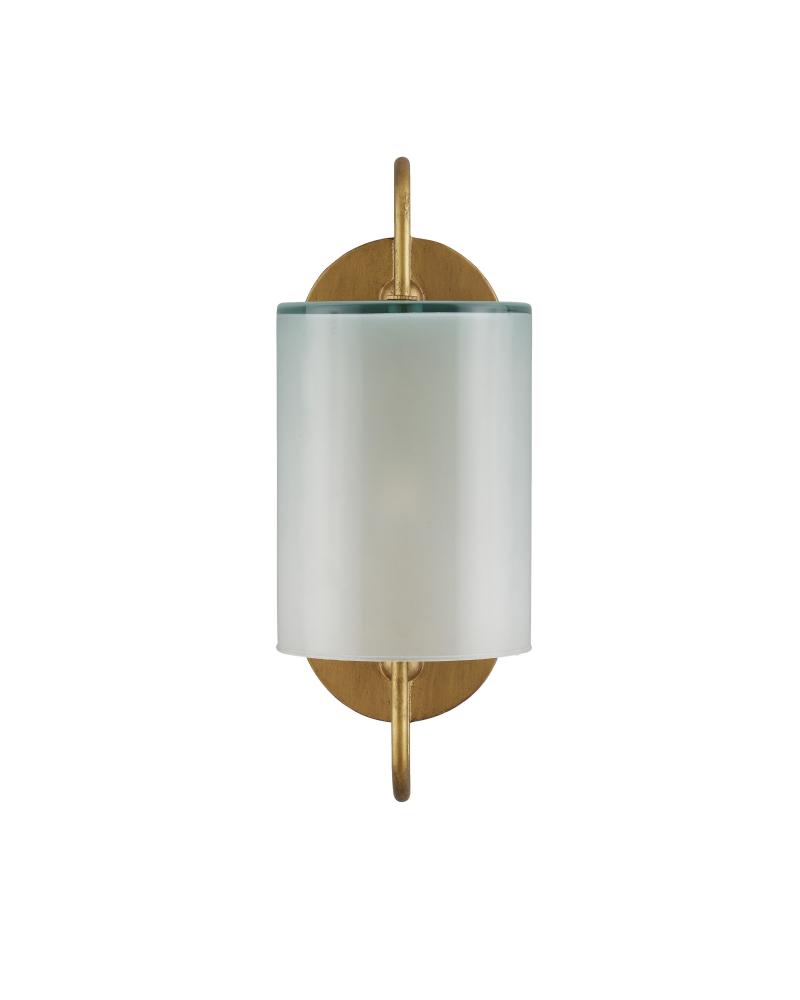 The frosted glass shade of the Glacier Brass Wall Sconce releases its illumination softly. Adding to its subdued appeal is the simplicity of its lines and the brass finish on its wrought iron frame. This glass wall sconce is included in our Bagno Collection of damp-rated lighting that is designed specifically for bathrooms.