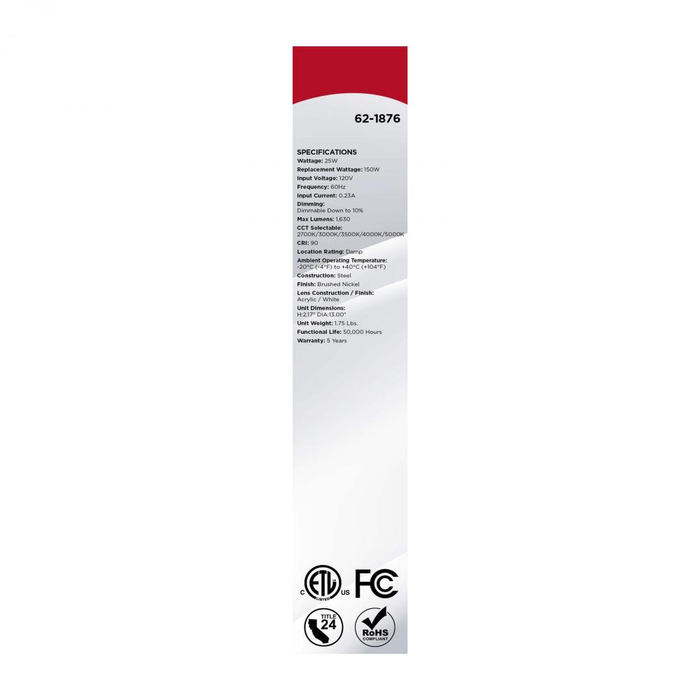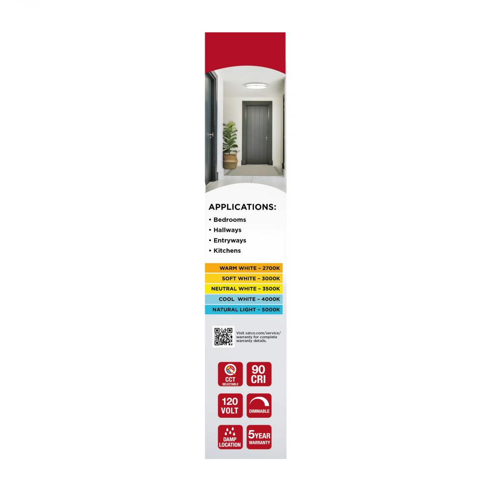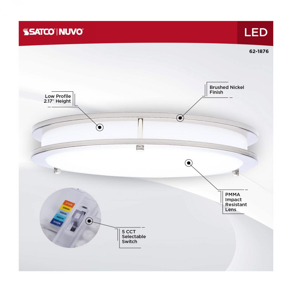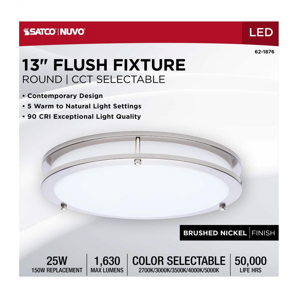 The SATCO NUVO 62-1876 Glamour 13-inch Round Flush Mount in Brushed Nickel delivers sleek, modern lighting with 5 CCT selectable technology (2700K–5000K) and 90 CRI illumination for enhanced color rendering. This 25-watt fixture replaces 150W incandescen