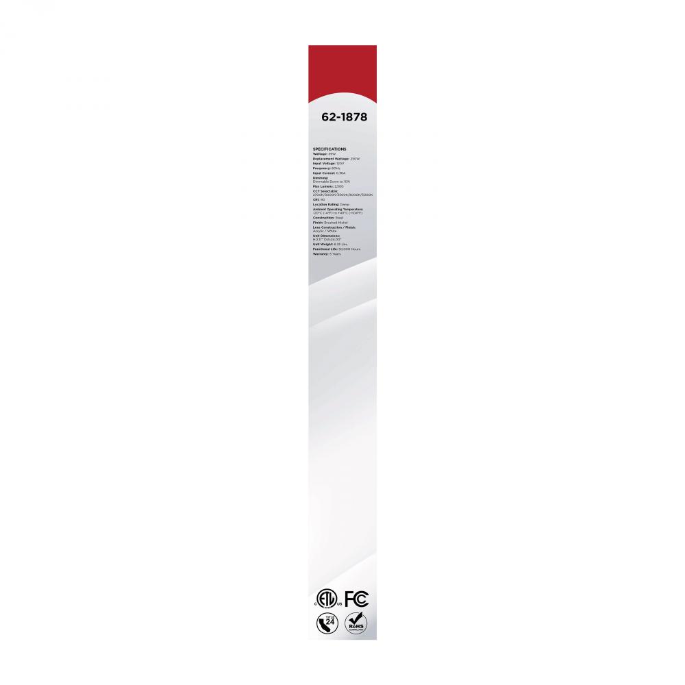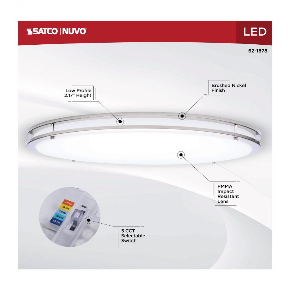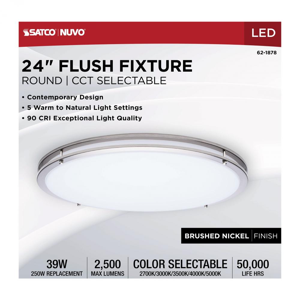 The SATCO NUVO 62-1878 Glamour 24-inch Round Flush Mount in Brushed Nickel delivers sleek, modern lighting with 5 CCT selectable technology (2700K–5000K) and 90 CRI illumination for enhanced color rendering. This 39-watt fixture replaces 250W incandescen