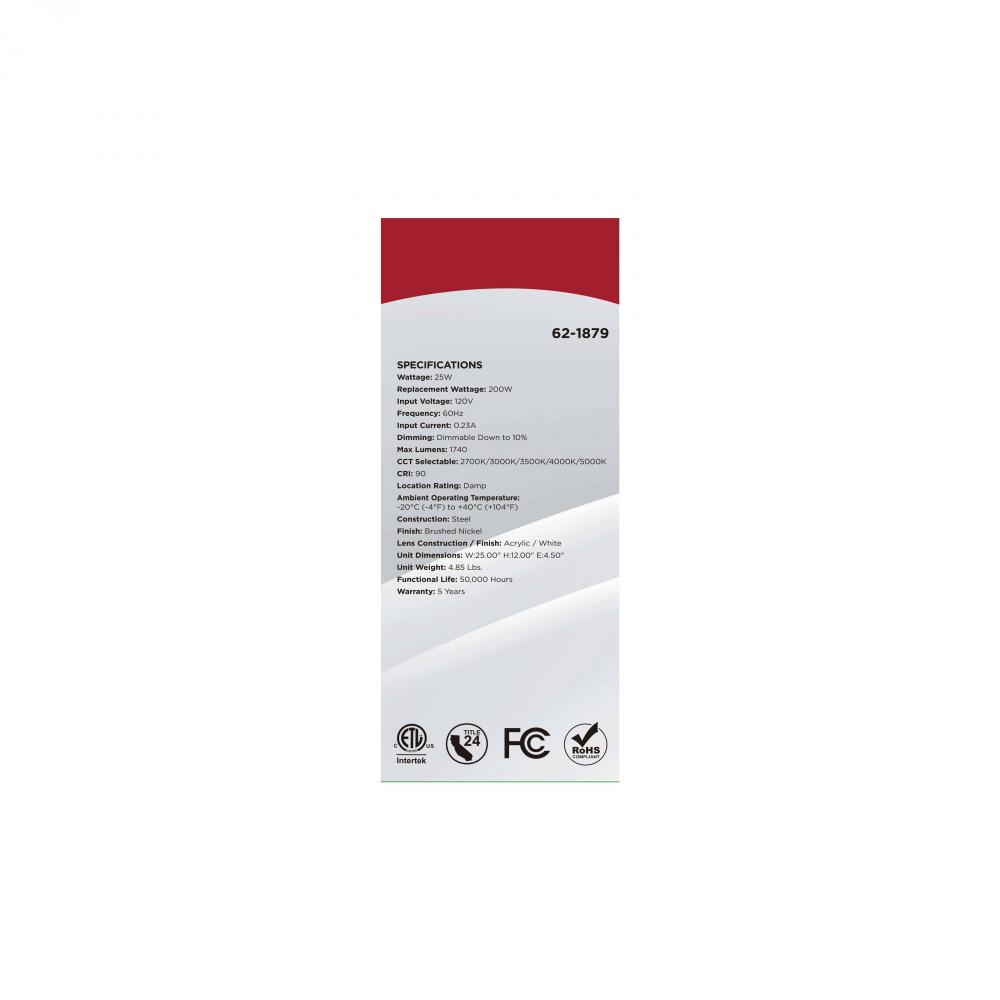 The SATCO NUVO 62-1879 Glamour 25-inch Linear Fixture in Brushed Nickel offers sleek, modern lighting with 5 CCT selectable technology (2700K–5000K) and 90 CRI illumination for vibrant color rendering. This 25-watt fixture replaces 200W incandescent ligh