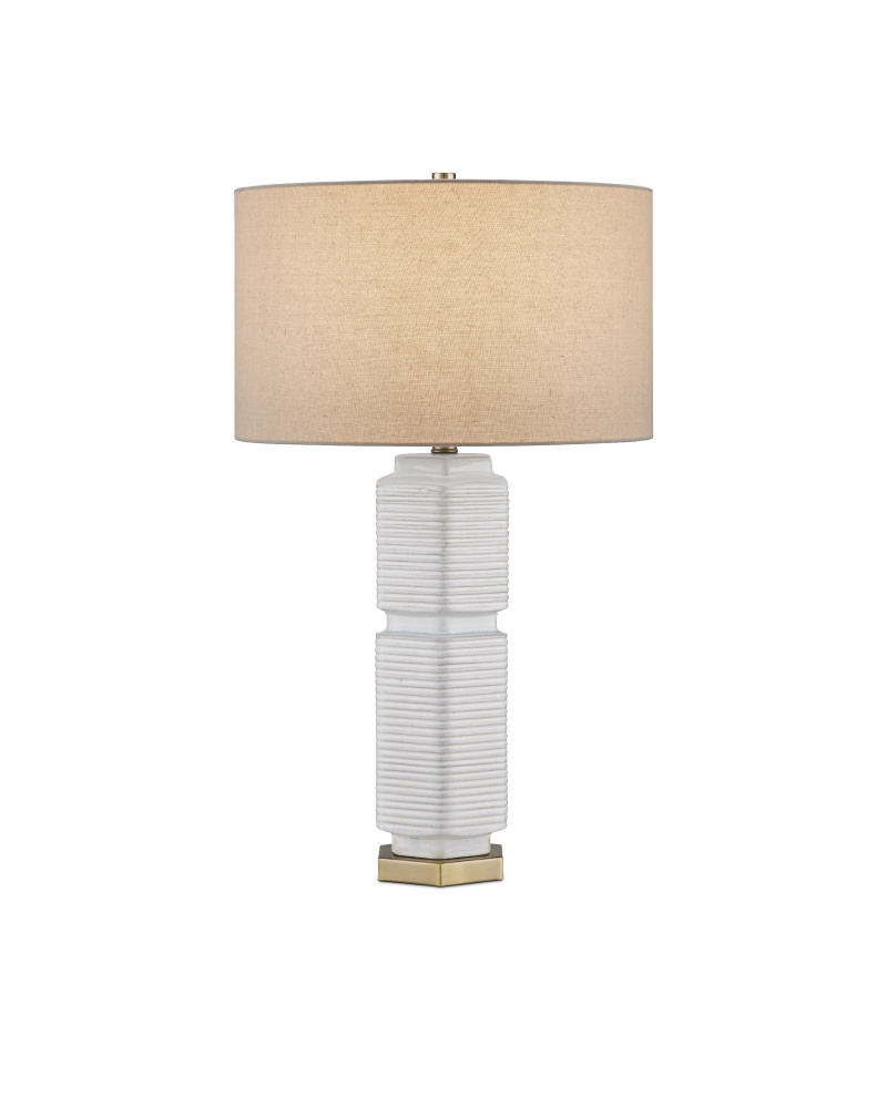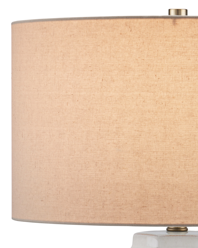 The Glebe Table Lamp has a hexagonal shape made of ceramic with a white glaze withvery subtle hints of beige and blue. The geometric complexity of this white lamp is heightened by the striated lines pressed into it and the indentions at the base, near its center, and as the body meets the hardware at the top. The base, hardware, and finial in an antique brass finish are warm elements to the design, as is the textural shade.