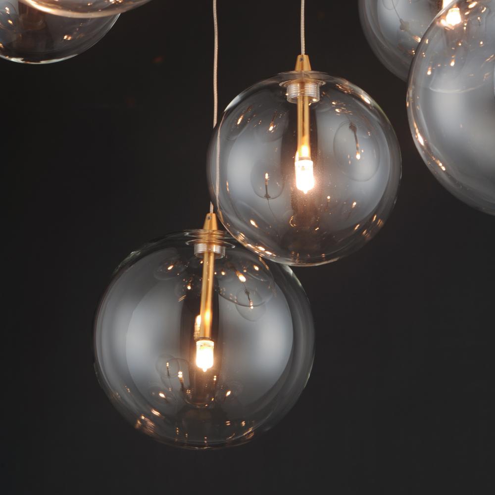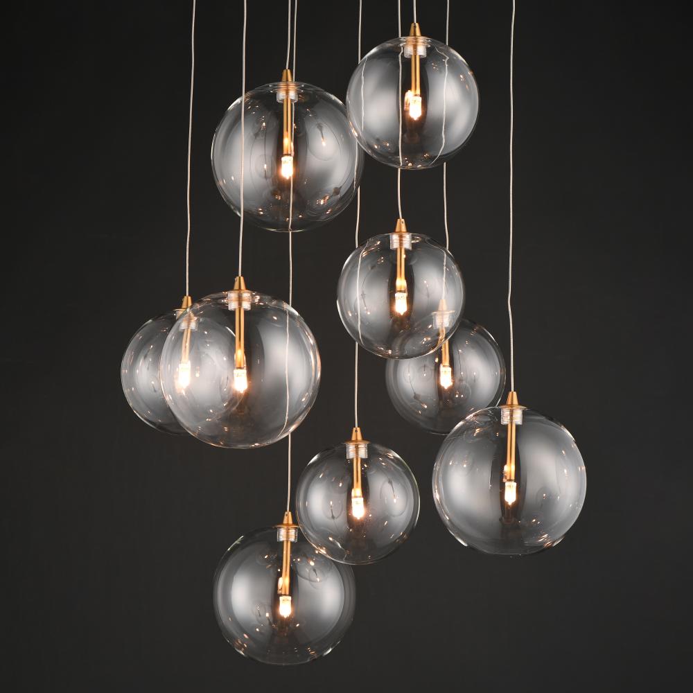 An airy configuration of Clear blown glass globe shades in various sizes suspend on thin low voltage wires. Thin tubes finished in Black or Gold descend into the center of the globes where a small G4 LED lamp provides a spark of light.