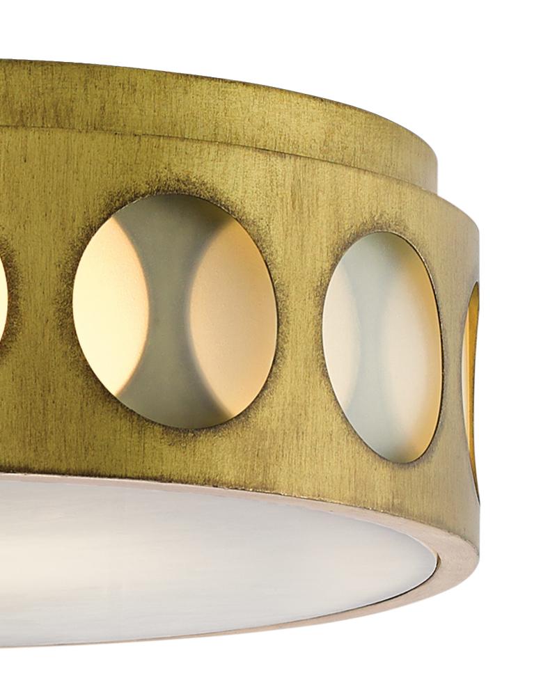 The Go-Go Flush Mount has a mid-century vibe with a shapely twist. The white opaque glass that makes up the vertical diffuser is slotted between two sheets of wrought iron that have been treated to a brass finish and off-set to create half-moon shapes within the row of circles on the flush mount. The bottom diffuser on this two-light fixture is also made of opaque glass. We offer a Go-Go pendant with the same dance of circles around its surface.
