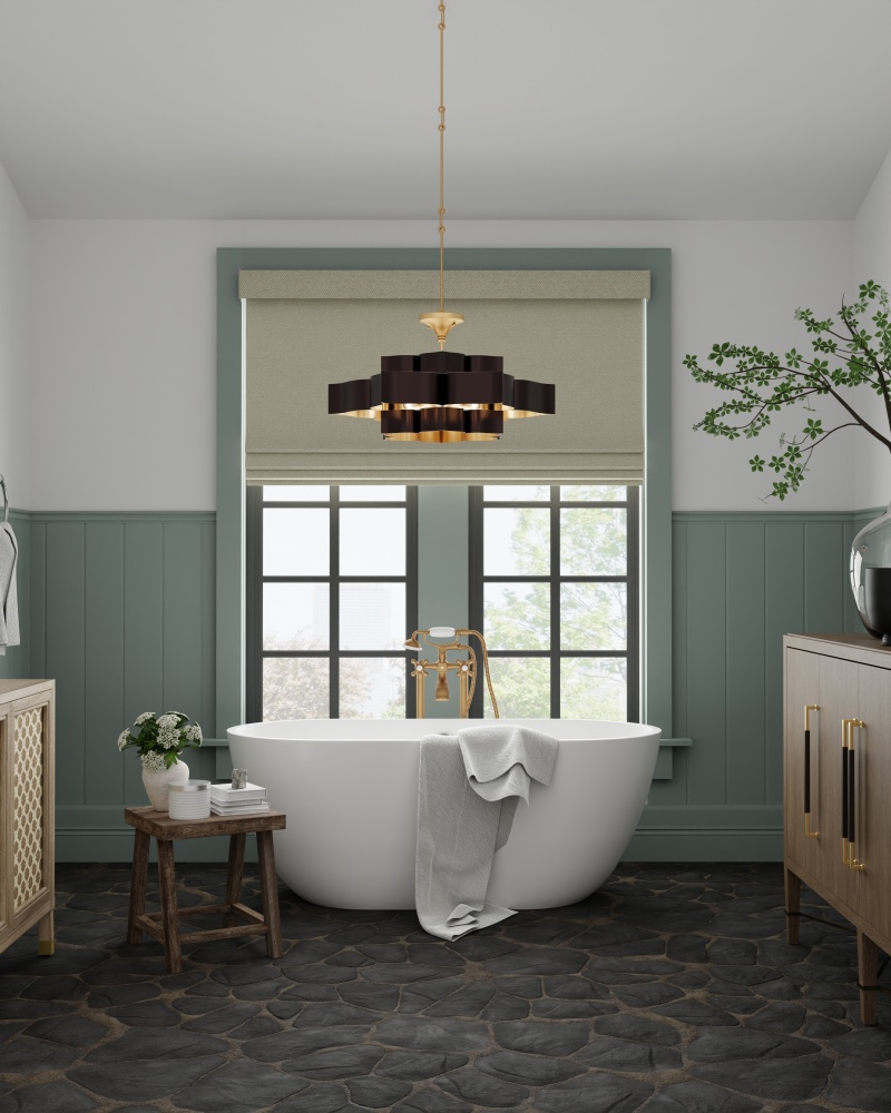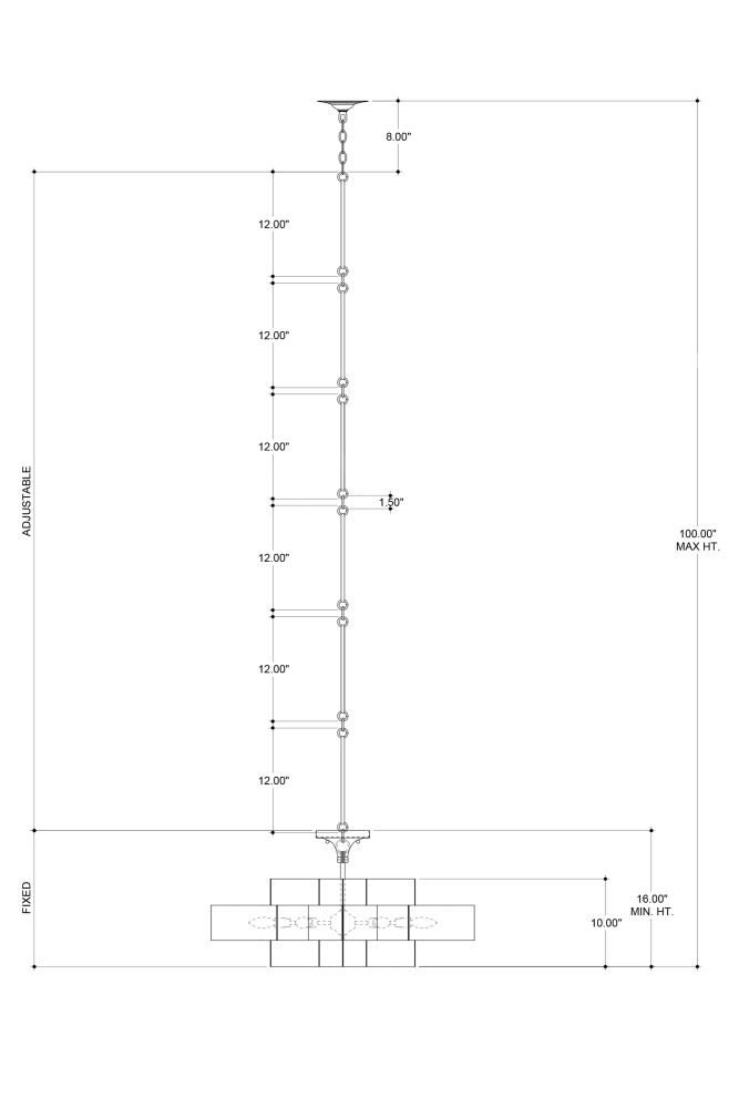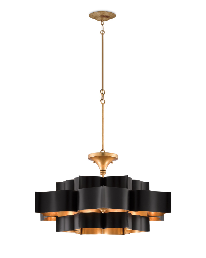 The Grand Lotus Black Large Chandelier receives its majestic good looks from a combination of stunning workmanship and a mix of satin black and contemporary gold leaf finishes. The black chandelier is skillfully fashioned from wrought iron. Adjustable from 16" to 100" with use of included chain/rod kit/cable. If your space calls for a longer drop, additional chain/rods/cable is available for purchase.