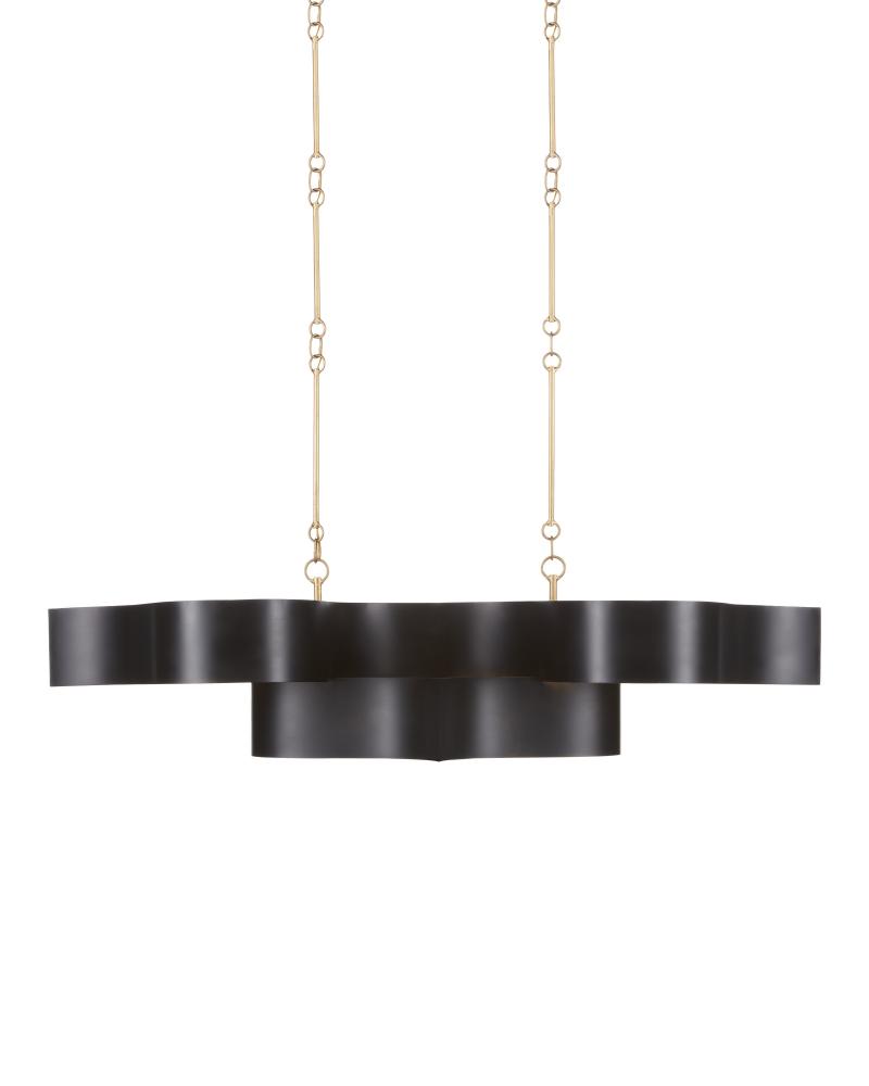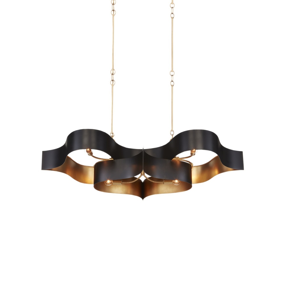 The Grand Lotus Black Oval Chandelier receives its majestic good looks from a combination of stunning workmanship and a mix of satin black and contemporary gold leaf finishes. The black chandelier is skillfully fashioned from wrought iron. Adjustable from 17" to 58" with use of included chain/rod kit/cable. If your space calls for a longer drop, additional chain/rods/cable is available for purchase.