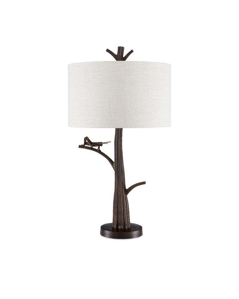 The playful insect on the Grasshopper Table Lamp plays hide and seek. View the lamp from the front and you see its pert profile; view it from the side and it goes incognito. The body of the lamp and the twig finial are made of cast aluminum to look like the trunk of a sapling. The bronze gold finish reads as convincingly close to a tree's true color.
