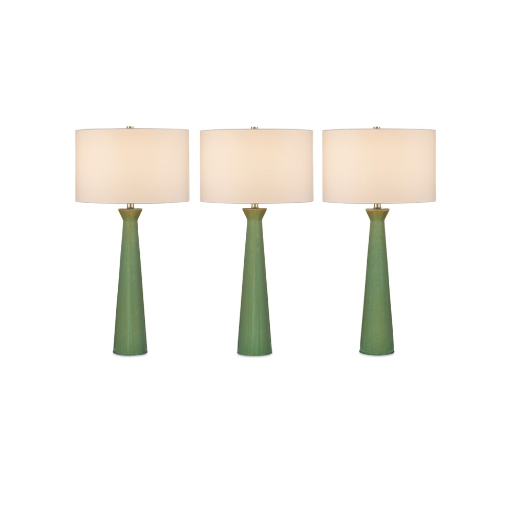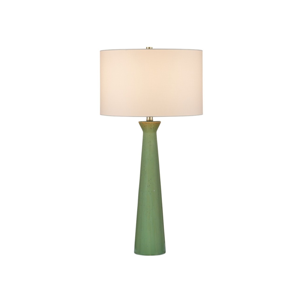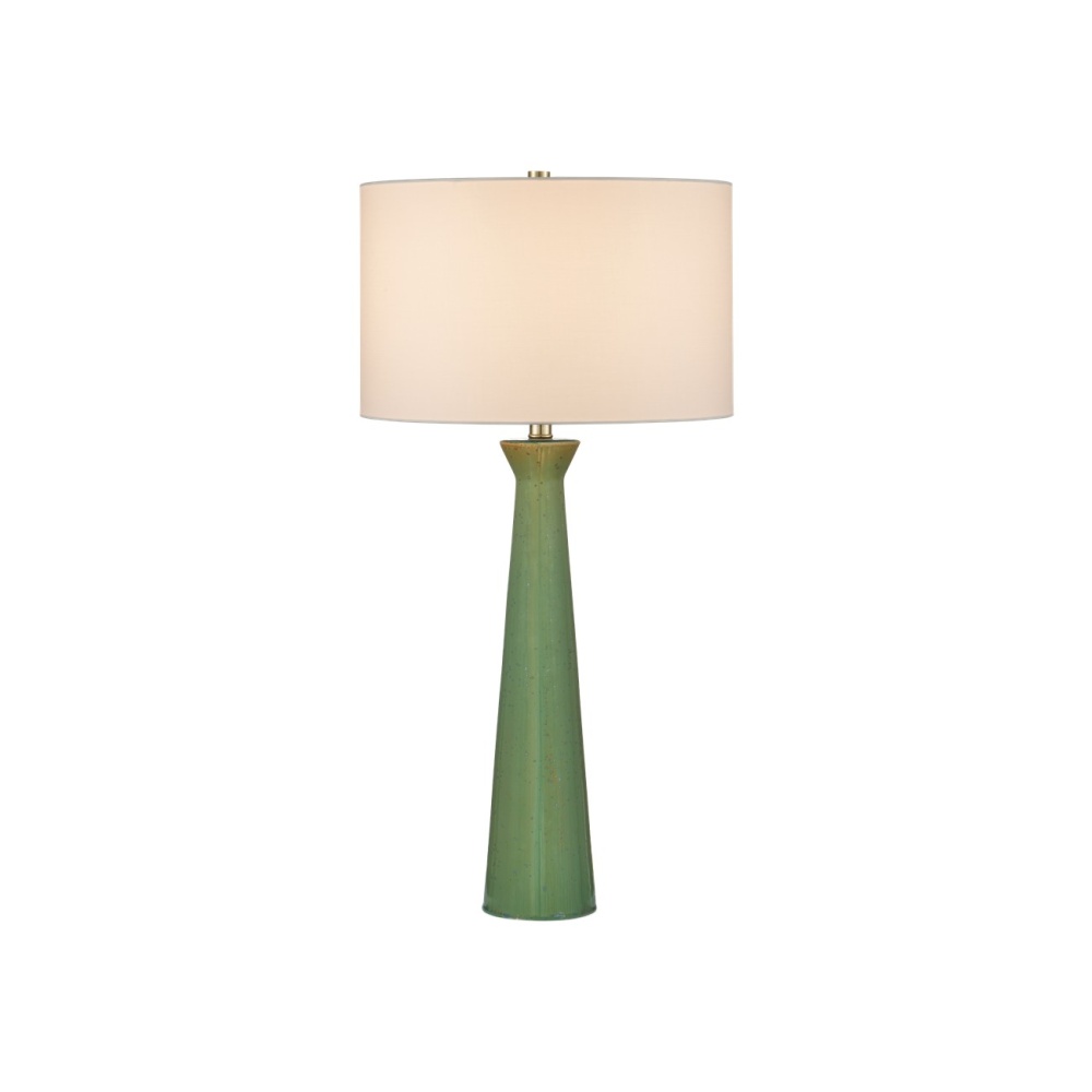 The Grassington Table Lamp has a telescoping columnar shape made of ceramic with a reactive celadon glaze on its surface that is poured on to create an ombré effect. As the glaze is applied, it flows down the ceramic to leave a lighter surface at the top and deeper tones as it moves toward the bottom. The green lamp is fitted with a drum shade that is oversized for the thinness of its silhouette to bring drama to its profile.