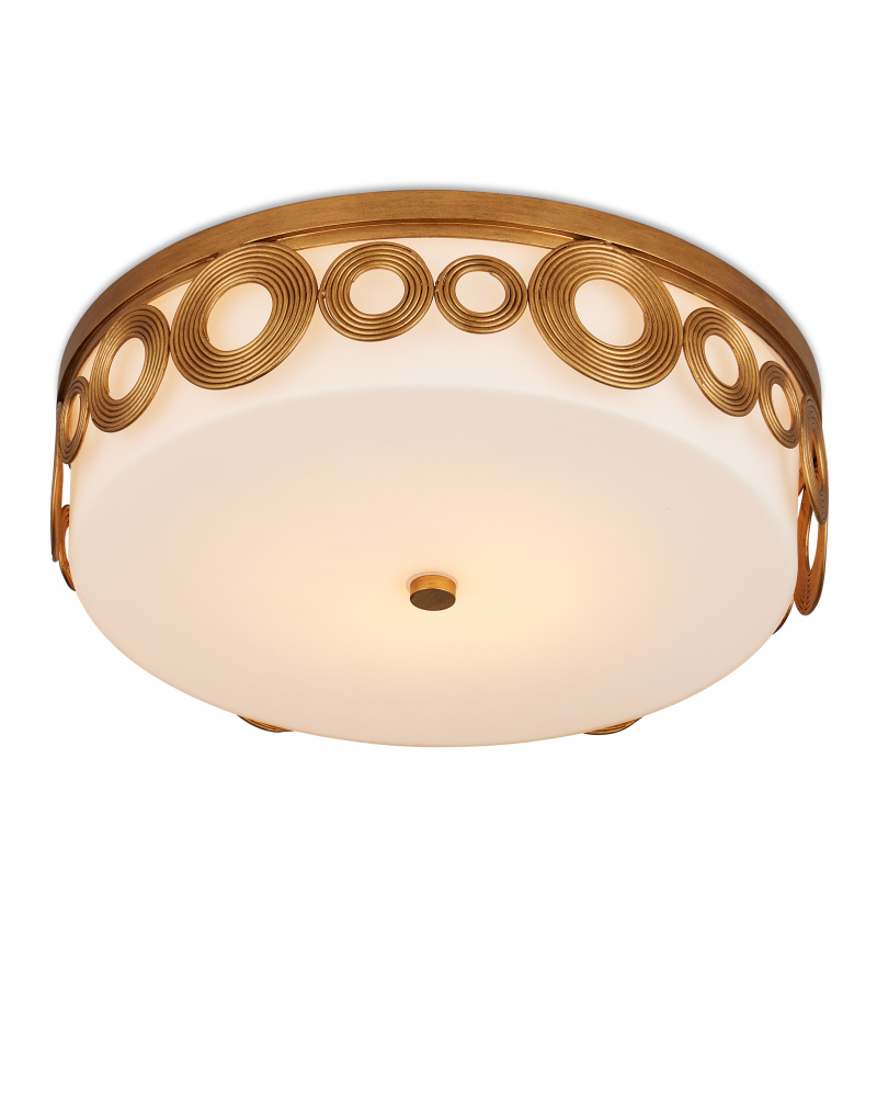 Inspired by a piece of Indian jewelry, the pattern flowing along the outer edge of the Gyges Flush Mount is designed to ornament like a necklace would a person. The decorative elements, frame, and finial are made of brass-finished wrought iron, surrounding the opaque white glass shade with warmth. The dense opacity of the shade creates a beautifully uniform glow when the lights are switched on, making this gold flush mount radiant.