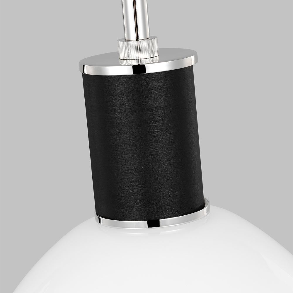 A single bulb is suspended through a frosted glass shade and accented with a black leather band.