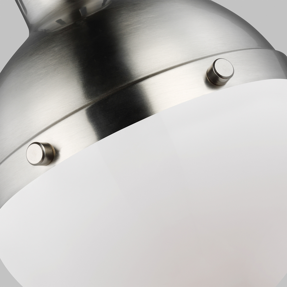 The Hanks medium modern pendant is offered in the Midnight Black/Satin Bronze, Antique Brushed Nickel, Satin Bronze, or Brushed Nickel finish. This globe style pendant is crafted with an antique finish and white glass shade, offering an approachable style with direct lighting. The multiple use of color and finishes exude mid-century modern style to help entice any updated space.
