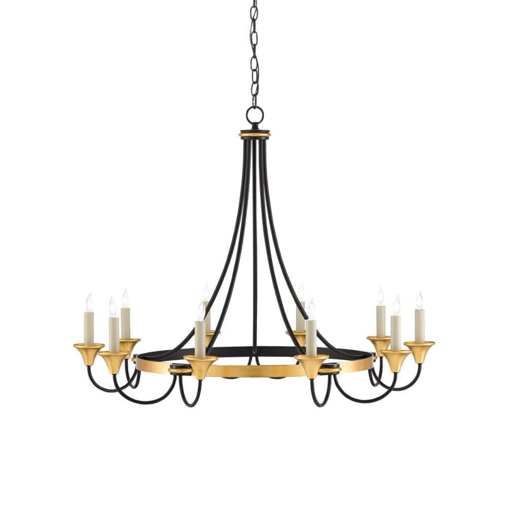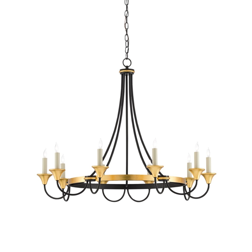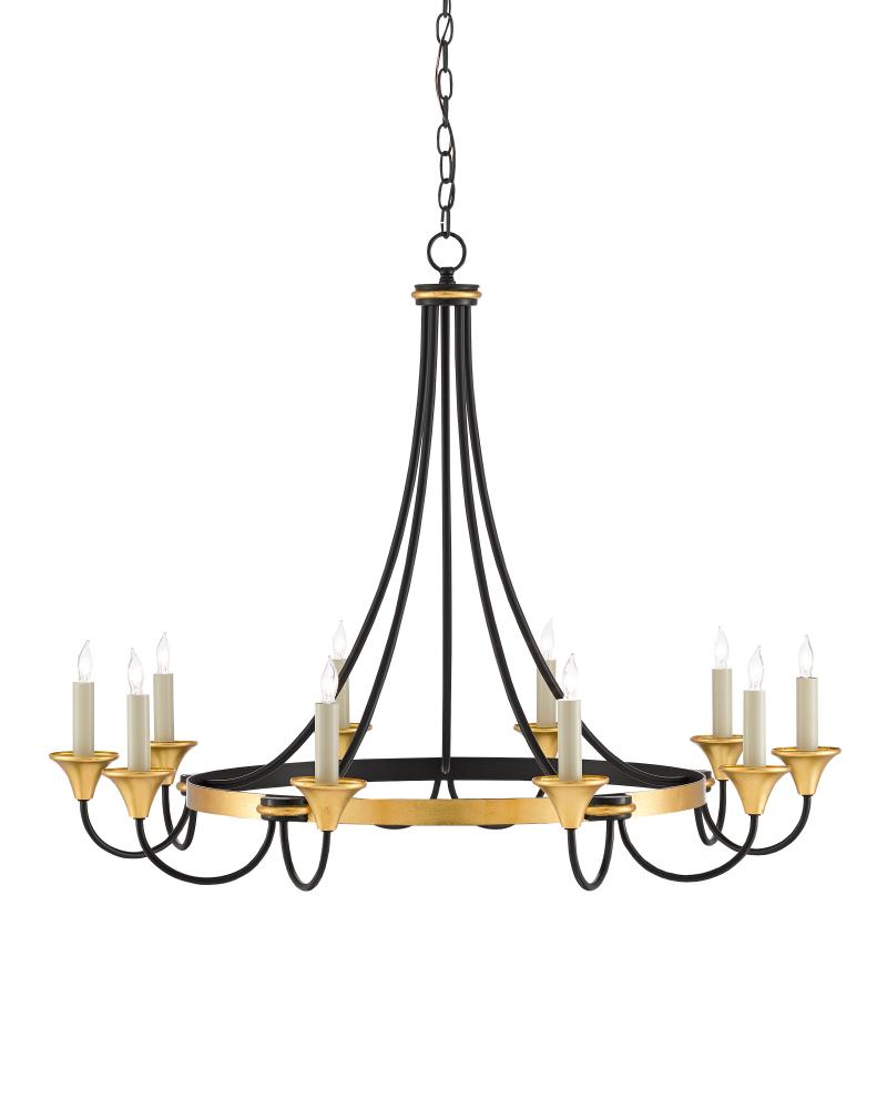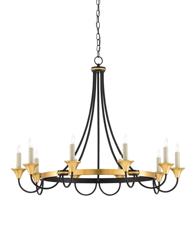 A graceful rendition of a classic chandelier shape, our Hanlon Chandelier will bring lovely illumination to traditional or transitional spaces. One of its strongest stylistic successes is the intermingling of matte and gleaming finishes. The ribs of metal curving from a simple crown have been treated to a washed black finish, while the bottom band, cup-like bobeches and thin ring around the crown are luminous in a contemporary gold finish.