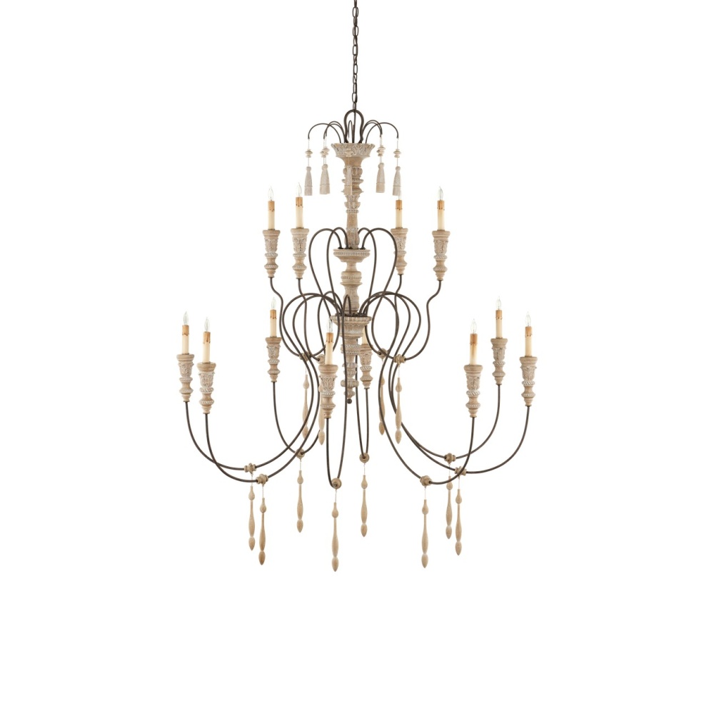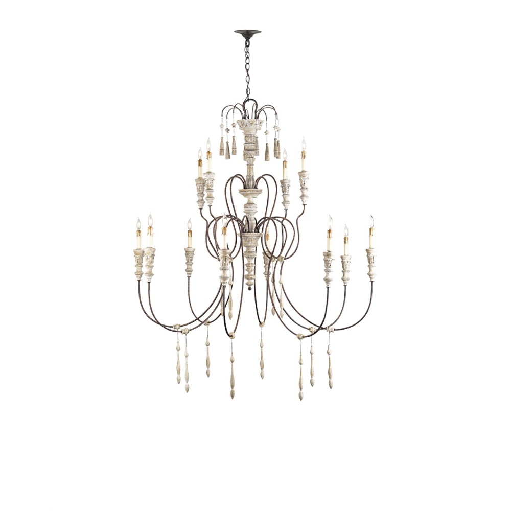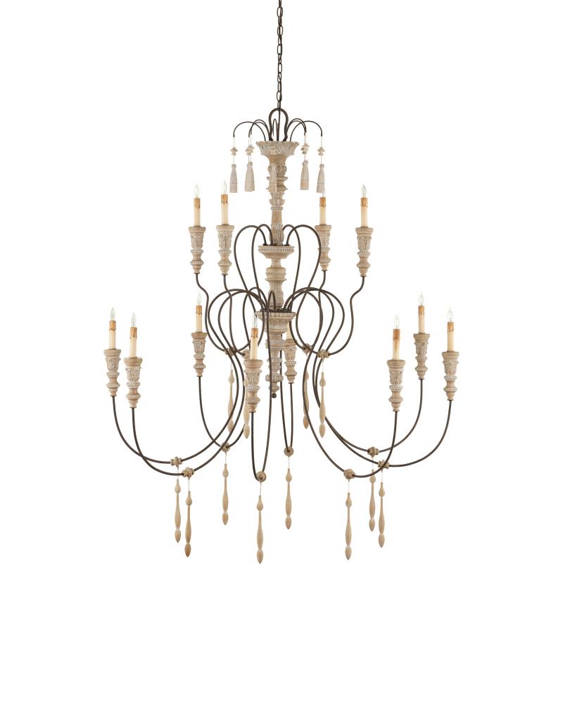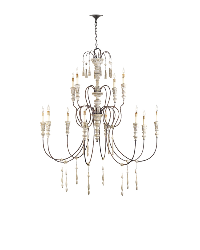 All of the exquisite details enlivening our series of Hannah Chandeliers are instilled into this large version befitting a lovely chateau in the South of France. The Hannah Chandelier provides the spaces it graces with a grand dose of charm. This exemplar of traditional European design shines brightly in large spaces. The 12-light chandelier has hand-carved accents, evocative of turned wood, that are made more graceful by our unique Stockholm white finish. The scalloped wrought-iron frame has been treated to a rust finish to bring a hint of aged beauty to this fixture.