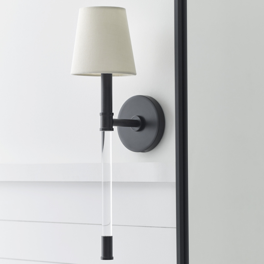 In the Hanover one-light wall sconce, a Lucite arm forms an elegant, dynamic silhouette that stems from a hub of either Burnished Brass and Polished Nickel finish and extends to matching color candle tubes, topped with exposed candelabra bulbs. Round backplate.