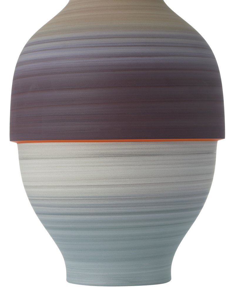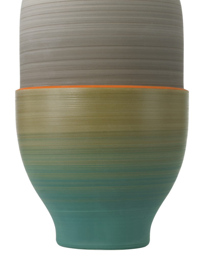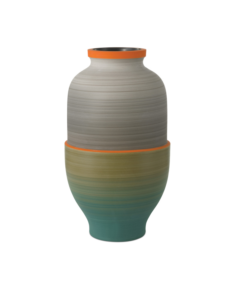 The Happy 80’s Gray, Beige, Orange & Blue Vase Set is a throwback to the decade when bold, vibrant, and eclectic ruled the stylistic spectrum—from interior design to fashion. Made of porcelain, the glazes on the exteriors of these vessels will vary because they are applied while the vases are spinning. This brings the two works of art a textural feel. The insides of the vases are covered in a black glaze, and the shapes of the vases reflect the nuances of the decade after which they are named.