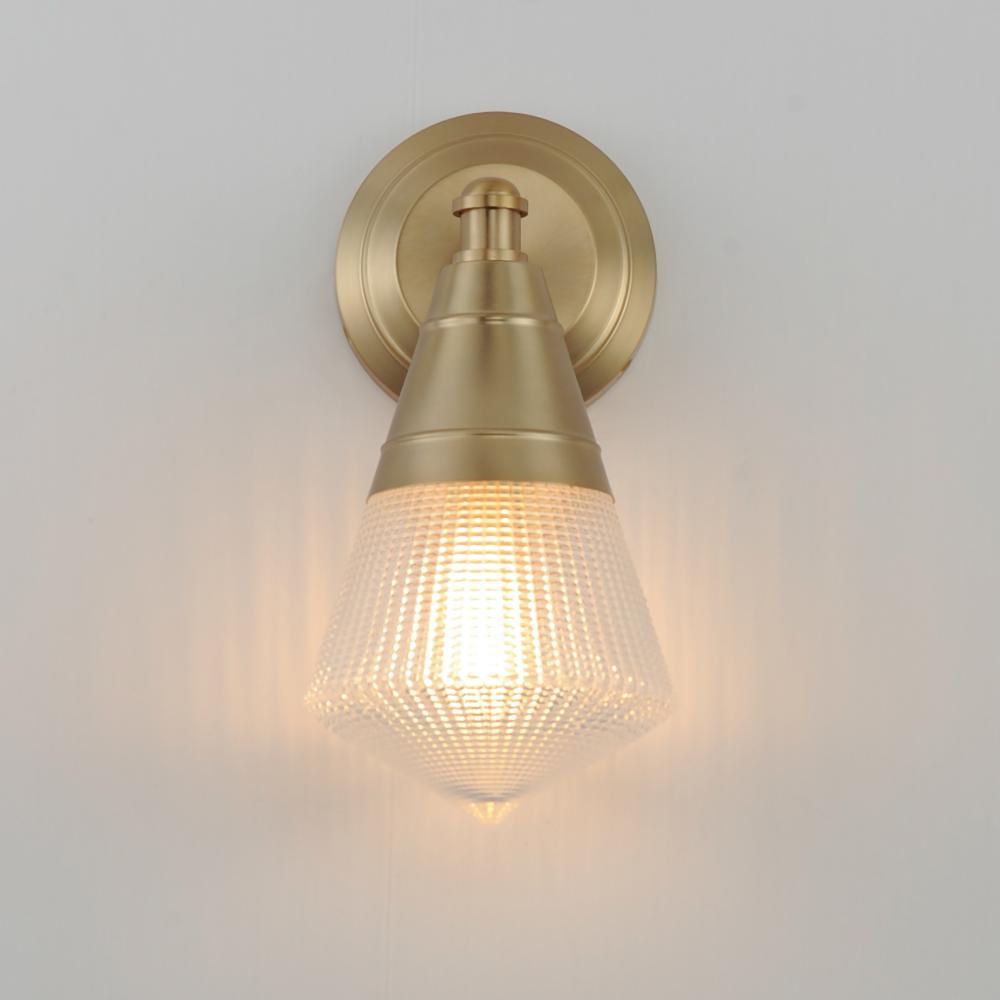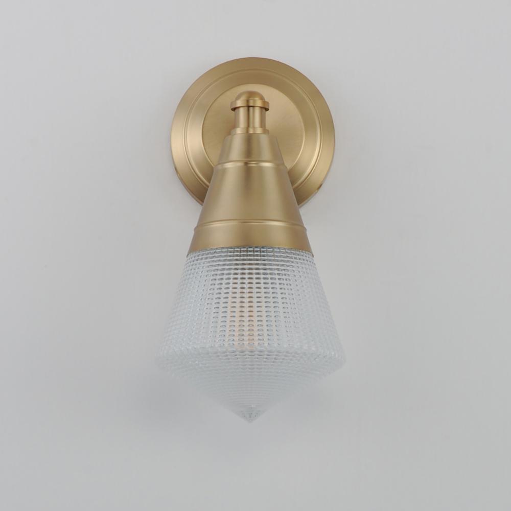 A prismatic diffusion of light is housed within pressed cone glass shades. Choose from pendants with tapered metal halves that conceal the light source or glass shades that are supported by a metal ring. Coordinating bath vanity lights complete the collect