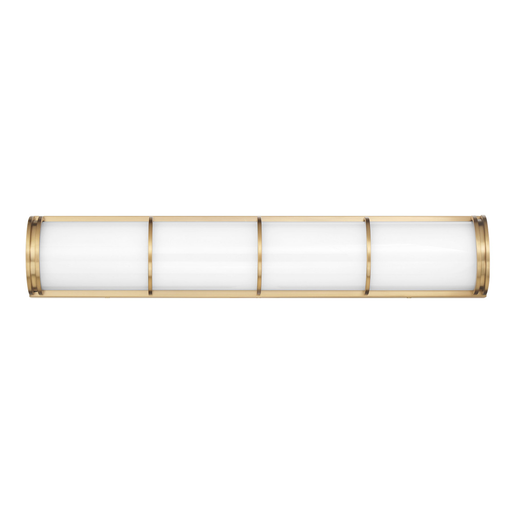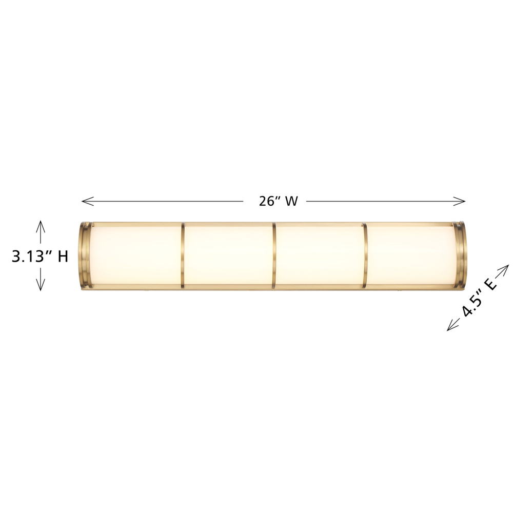 This Savoy House Harper LED wall light has a super sleek and chic look that makes it an ideal solution for bathroom vanities, hallways, foyers or any other space that needs a big dose of bright, contemporary illumination. The etched white glass shade is accentuated by slim detailing that is finished in Warm Brass, creating a perfect pairing. Harper is 3.13" in height, 26" in width and extends 4.5" from the wall. It is illuminated by integrated LED light, giving off 2550 lumens at a CRI of 90 and a color temperature of 3000K.
