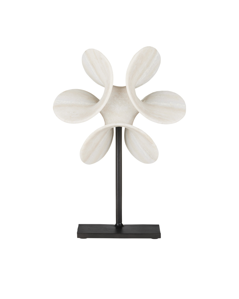 The propeller shape of the Helice Large Marble Ring will be a dynamic presence in a space; the white sculpture a feat only an accomplished stone carver could create. The flowing lines as they reach the bottom of the piece envelope the black metal stem to which it is attached. The stem and the base are pared down, adding a nice contrast tonally and structurally. Because the Helice is carved from natural marble, each sculpture will vary slightly.