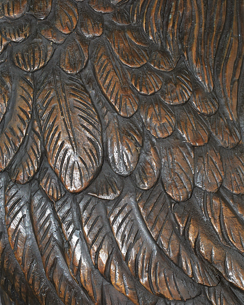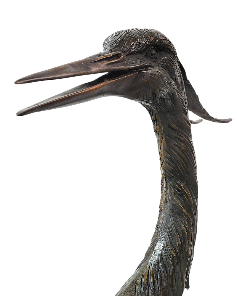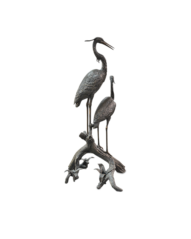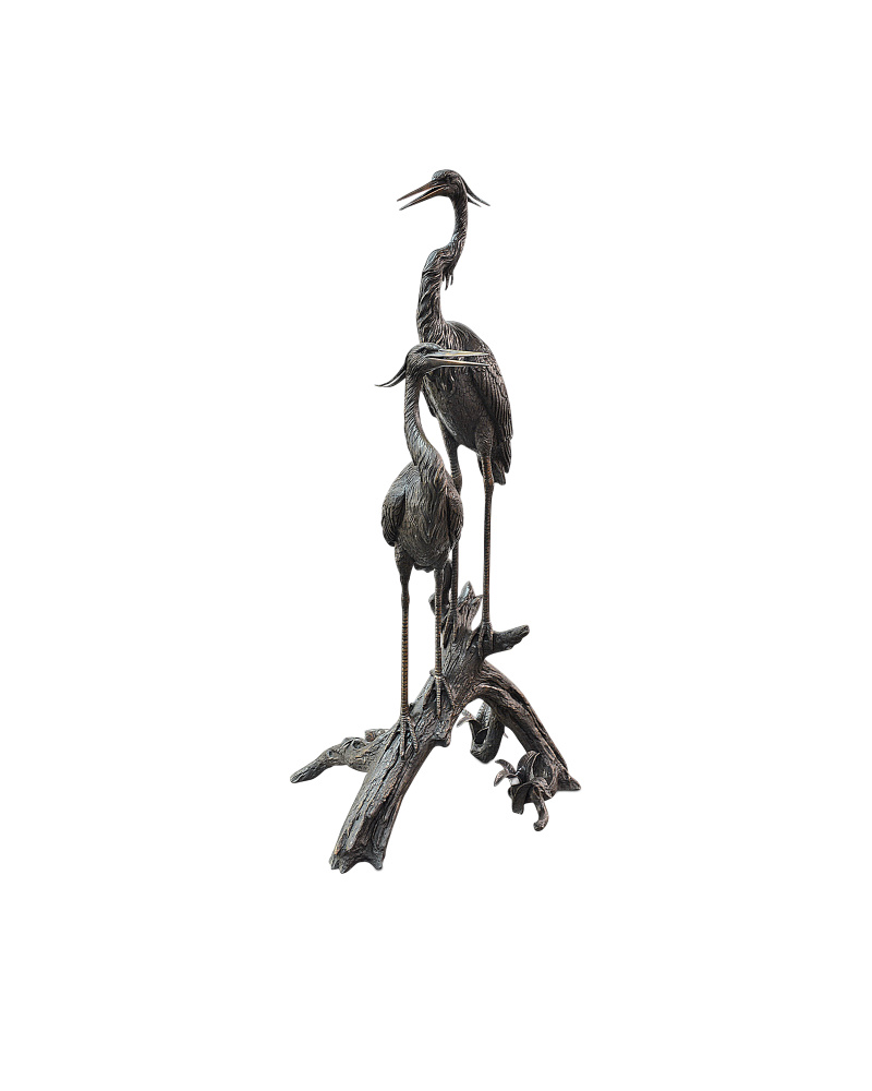 Mimicking a grand classic found in many Japanese gardens, the Herons on Branch Bronze sculpture is beautifully lifelike and evocative. Their open beaks and long legs are hyper-realistic, and their head, neck and wing plumes are so delicately rendered they seem to be fluttering in the breeze. The driftwood on which they are perched is equally naturalistic.