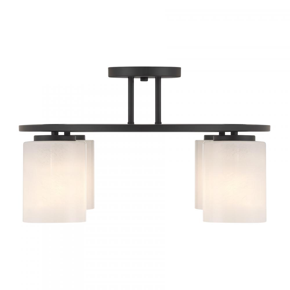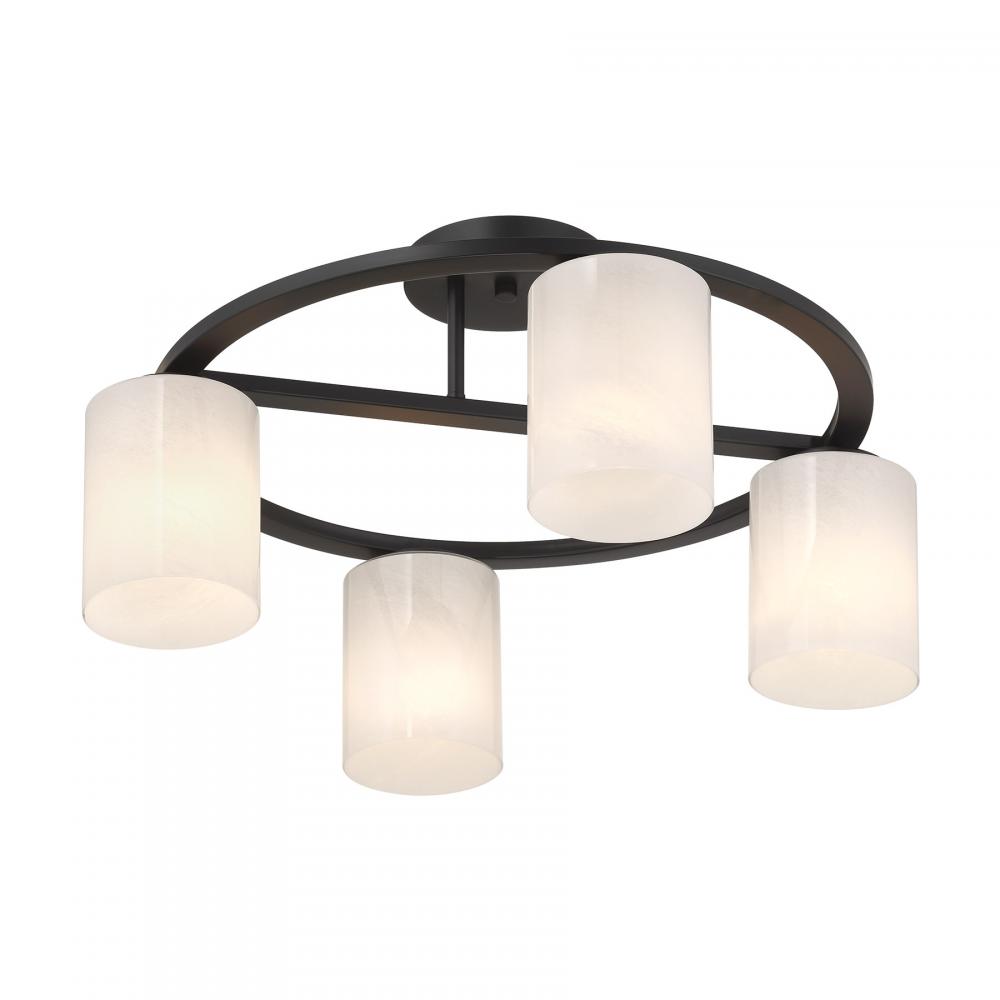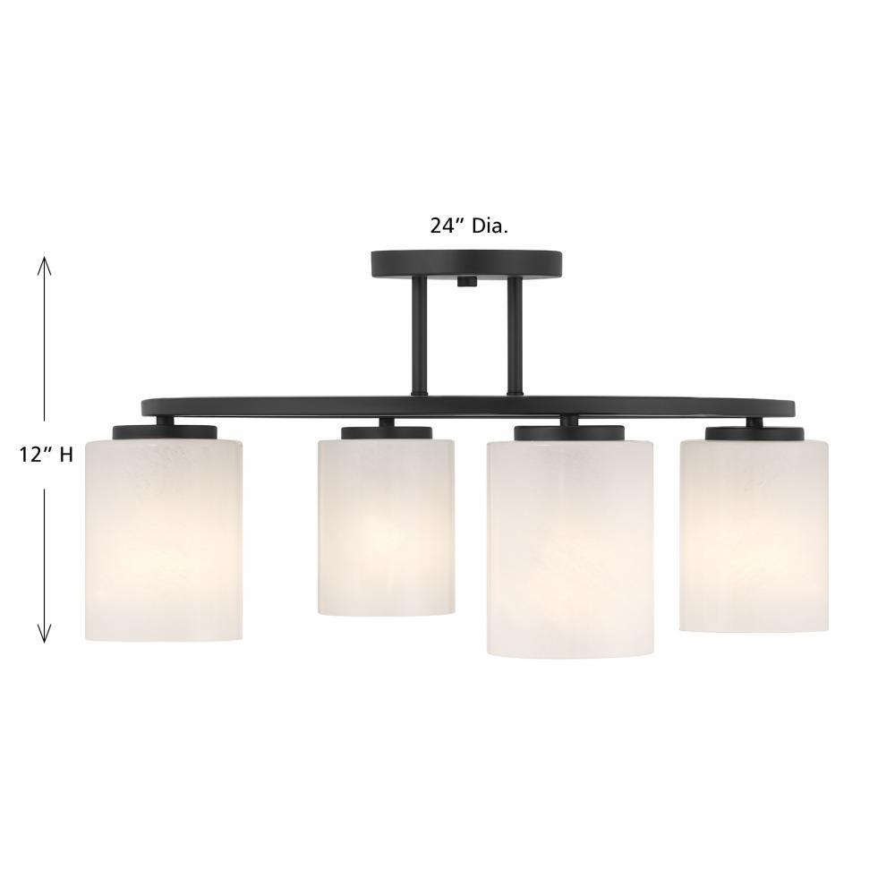 Illuminate any room with the bold modern style of the Savoy House Herron 4-light ceiling semi-flush mount. Its sleek, round structure wears a Matte Black finish and is decorated with cylinders of swirling, stunning strie glass. Herron is 12" in height and 24" in width. It uses four standard size bulbs of up to 60 watts per bulb. Bulbs not included.