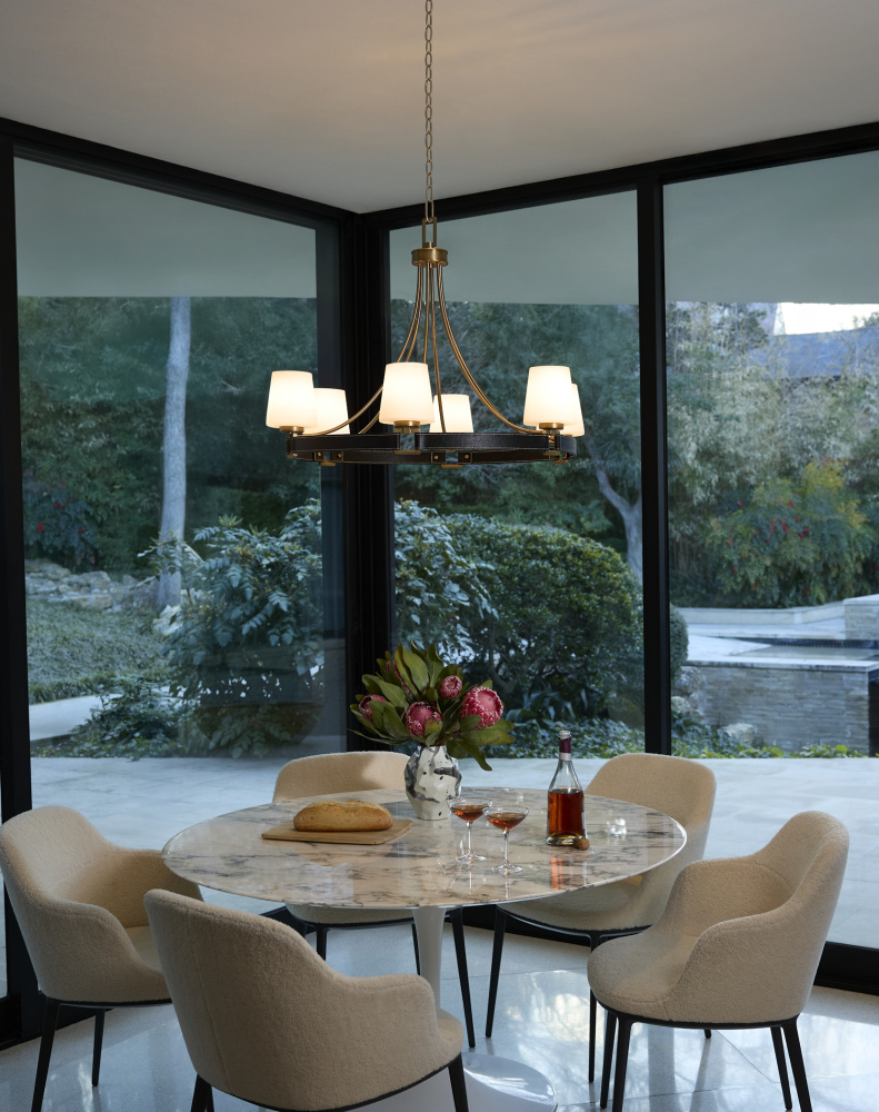 Hidalgo chandelier blends upscale design with mixed materials, featuring a crown-style frame. Fashion-inspired leather trims paired with buckle accents add contrast and depth to the rich design. This chandelier pairs beautifully with the matching wall mount, allowing you to create a cohesive look that seamlessly ties together traditional and casual spaces.