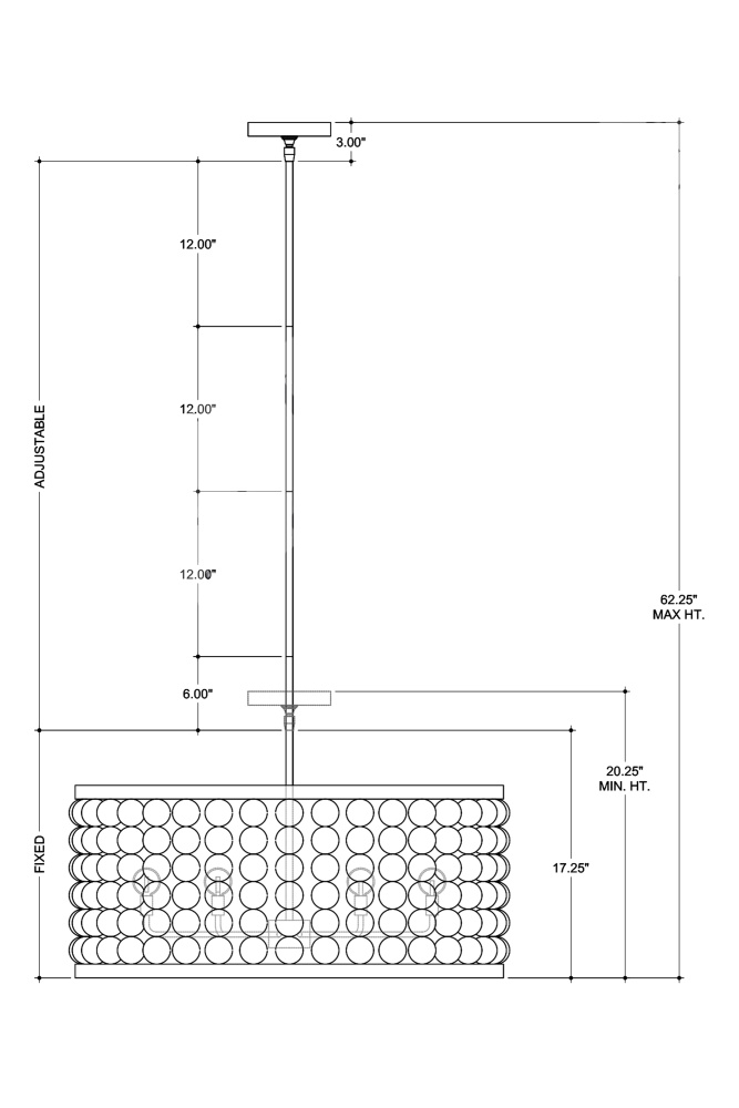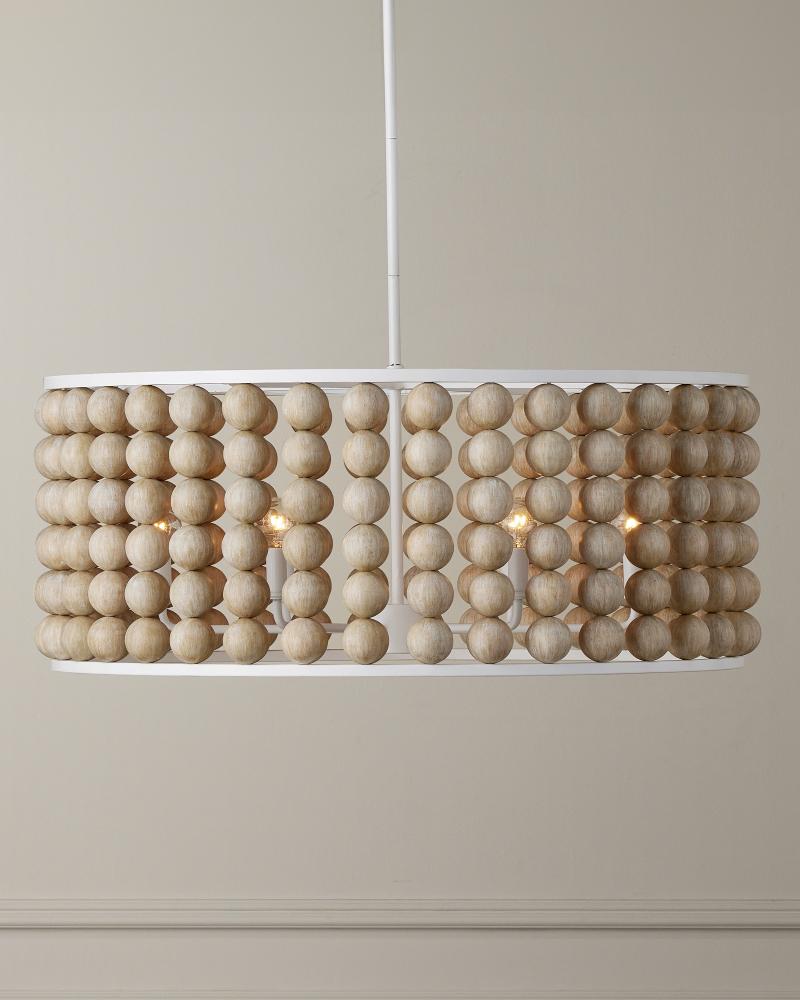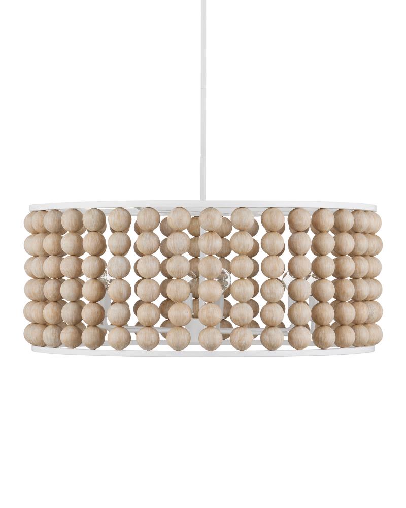 The wooden beads are the centerpiece of the Holcroft Chandelier, with the design built around them to create a striking fixture. The Sandstone-finished beads are fastened to a wrought iron frame, which hangs from a rod, both in a Sugar White finish that gives the chandelier a surprisingly light appearance. The large size of the beads adds an unexpected element to the design, which leans toward a bohemian style. Adjustable from 20.25" to 62.25" with use of included chain/rod kit/cable. If your space calls for a longer drop, additional chain/rods/cable is available for purchase.