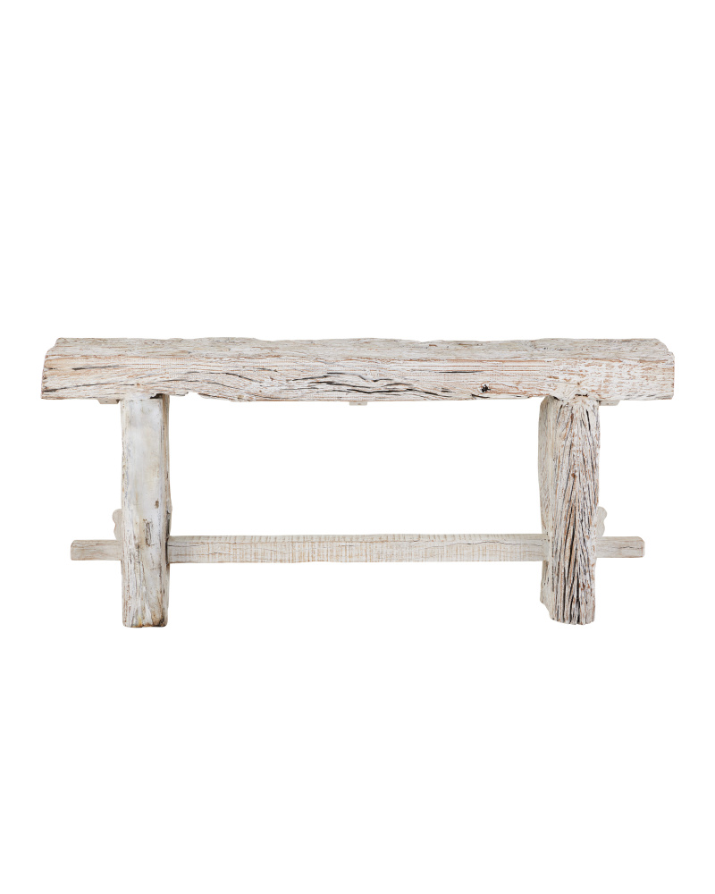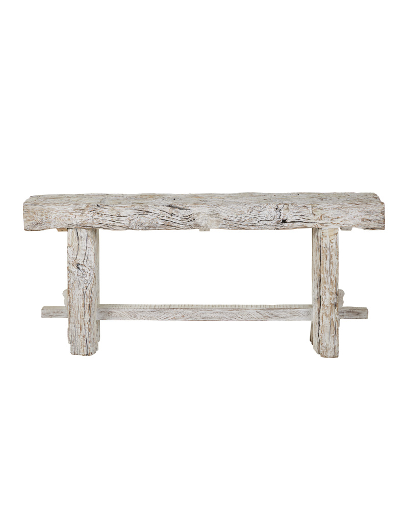 The Holland Console Table is a sustainable piece given it is made from reclaimed wood that is remarkably aged, which brings its surfaces tremendous personality, as does the trestle design with its mortise and tenon joinery. Because the whitewashed table is made from such raw wood, no two will be exactly alike. This piece is meant to be placed indoors only.