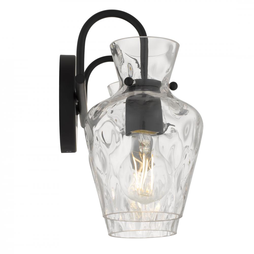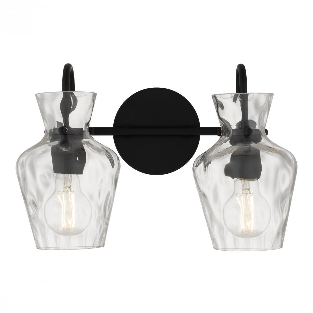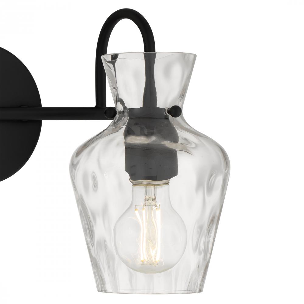 The Hollis vanity light blends modern simplicity with artisanal charm. Its matte black finish provides a sleek, timeless backdrop, while the clear hammered glass shades shimmer like water touched by sunlight. Each curve of glass adds texture and depth, cre