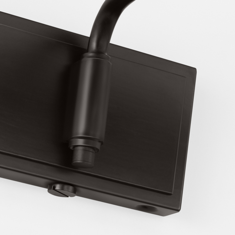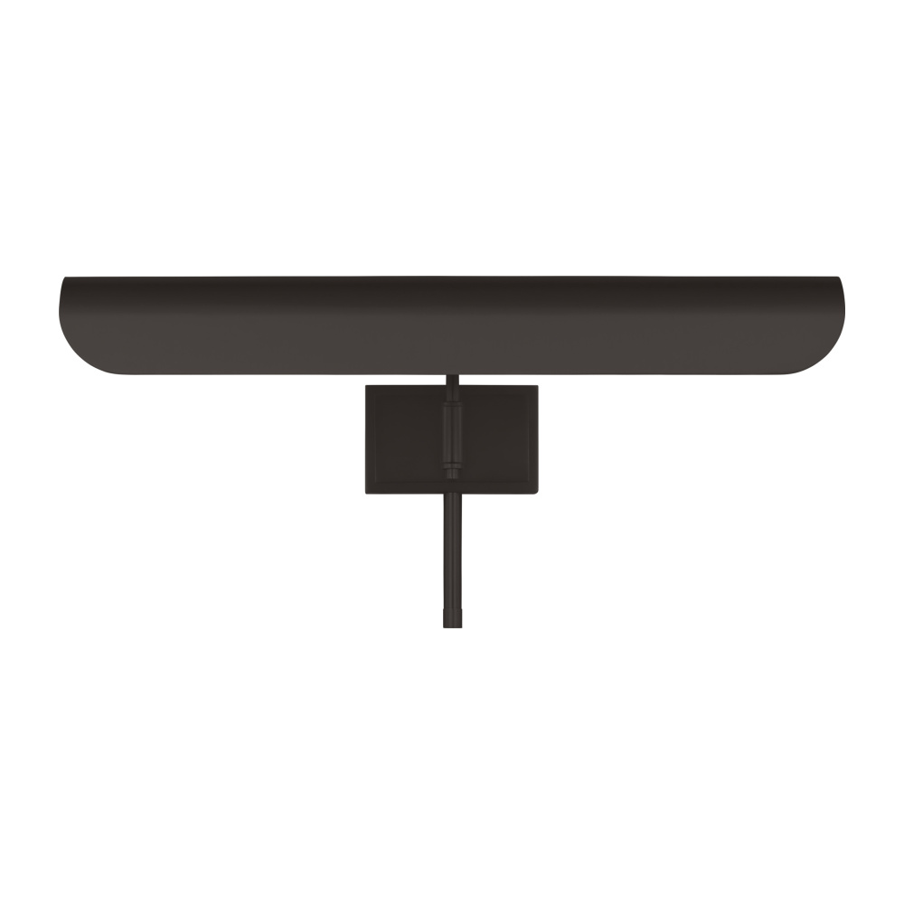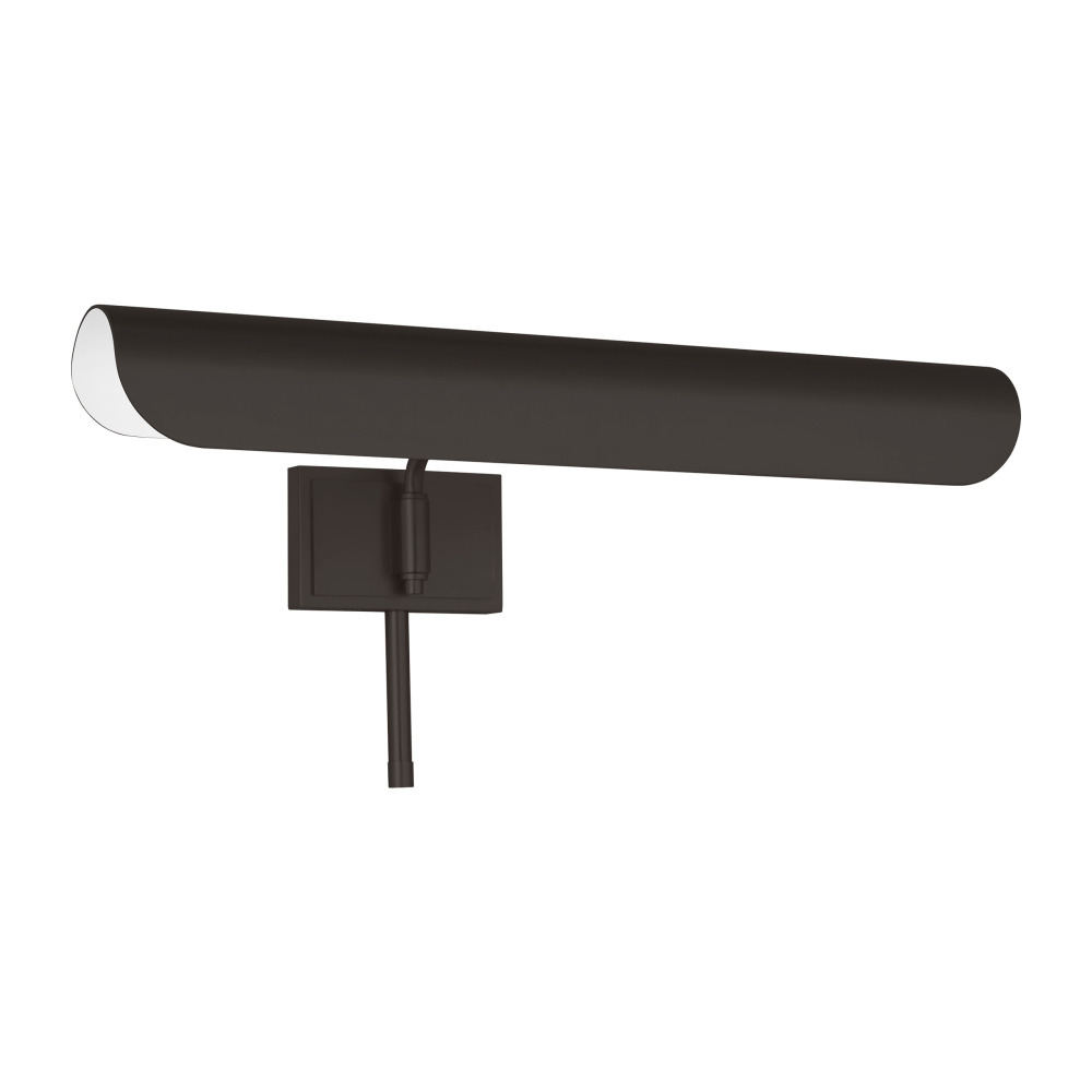Inspired by a ship's outer hull, the Hull series by Chapman & Myers has a unique shade of these picture lights made from a single piece of metal bent into a cylindrical form. These picture lights have an open-ended design directing light both down and to the sides. A subtle horse saddle design and double barrel back-plate detail that pivots in the direction needed. Available in three sizes and two finish options.