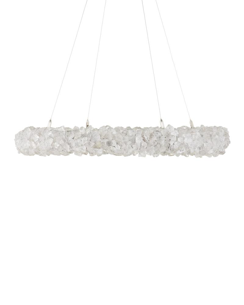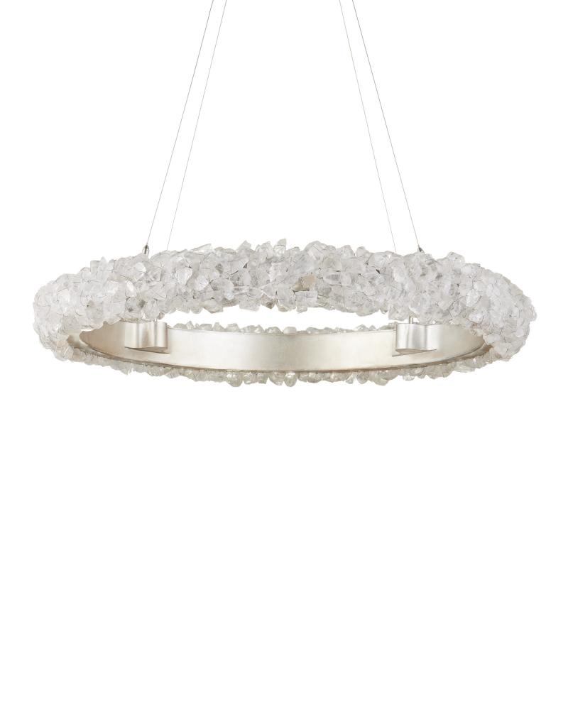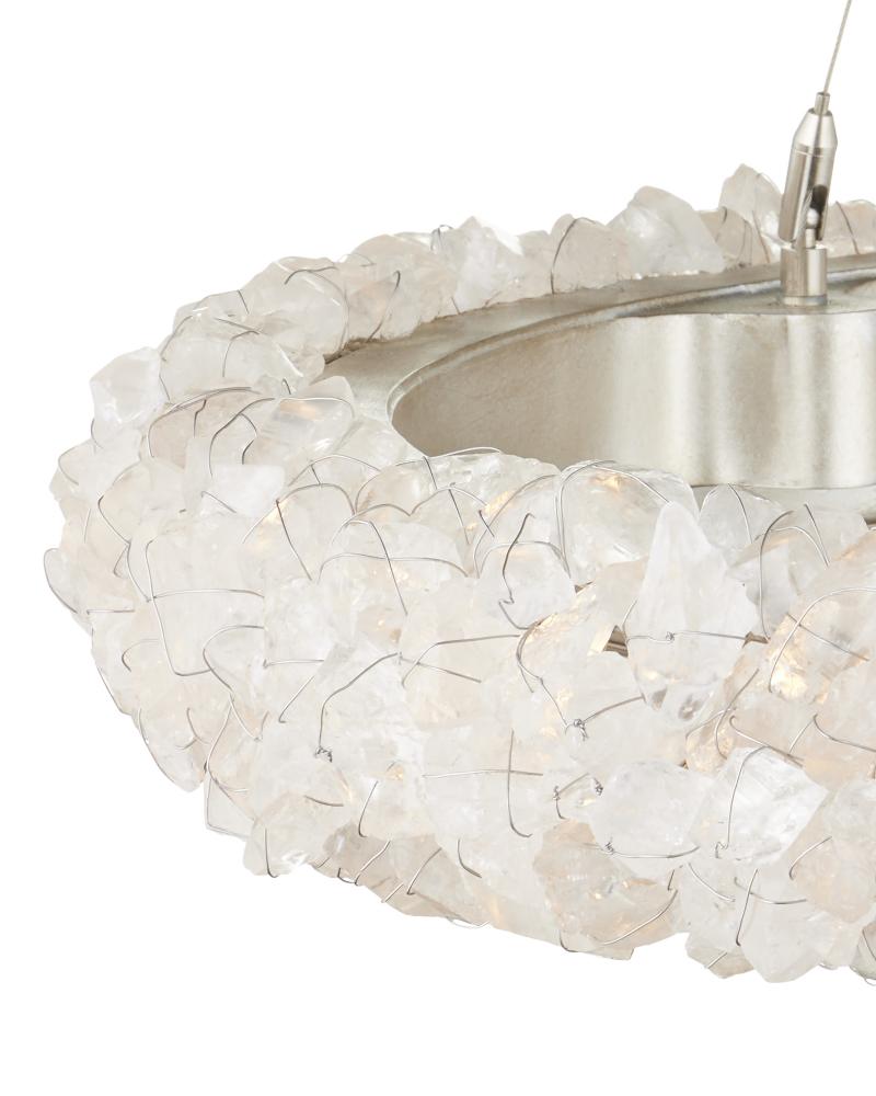 The Iconoclast Chandelier is a sparkling beauty with natural rock crystal affixed to a sturdy wrought iron frame in a contemporary silver leaf finish. Designed with attention to detail, the white wall sconce features rock crystals attached with very thin wire, creating visual interest without interfering with the luminosity of the stones. The pieces of pale material filter the light in the same way ice might, enhancing the beauty of this fixture. Adjustable from 24" to 148" with use of included chain/rod kit/cable. If your space calls for a longer drop, additional chain/rods/cable is available for purchase.