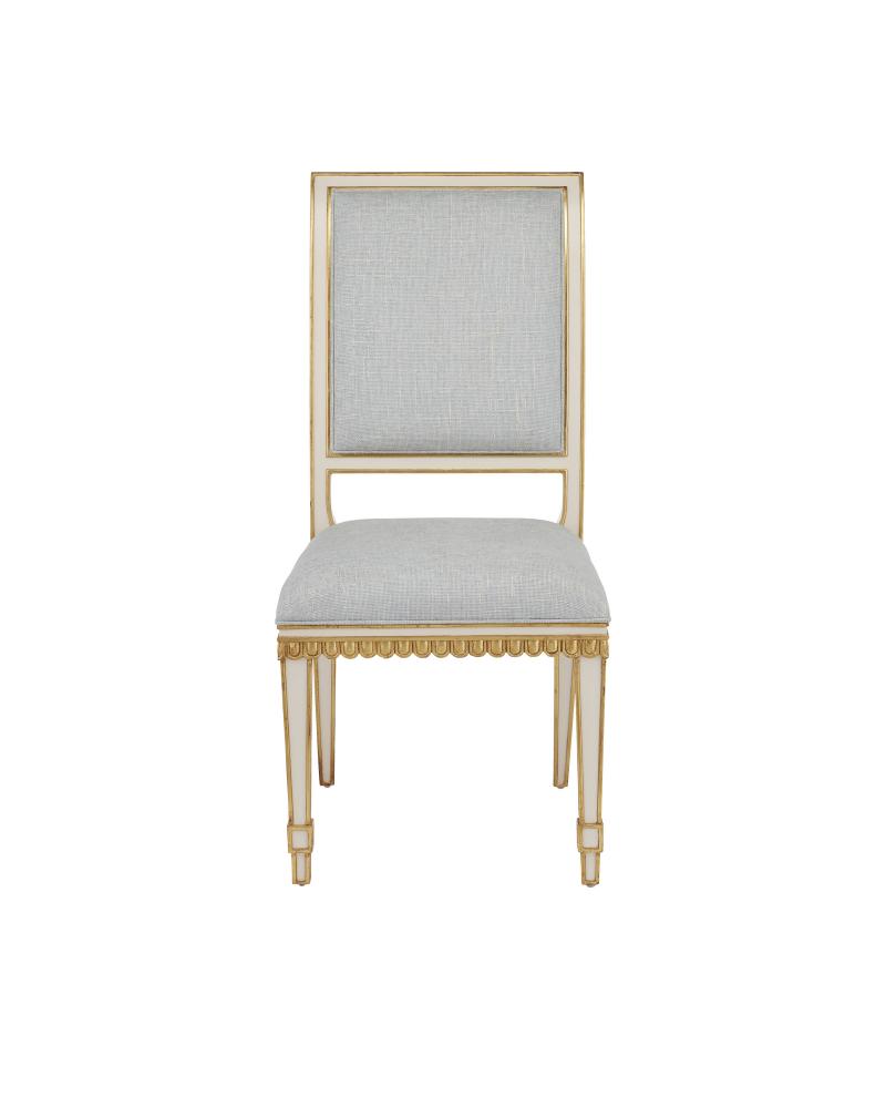 Inspired by a vintage Swedish Gustavian design, the Ines Ivory Chair with a Mixology Moonstone fabric seat exhibits the traditional light gray and pale white tones you’d expect from this famed stylistic era. The mahogany frame in an ivory finish is ornamented with antique gold accents that infuse the chair's design with added elegance. for anyone who seeks out furnishings that imitate European antiques with great pedigree, this is an excellent alternative.