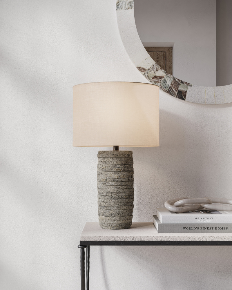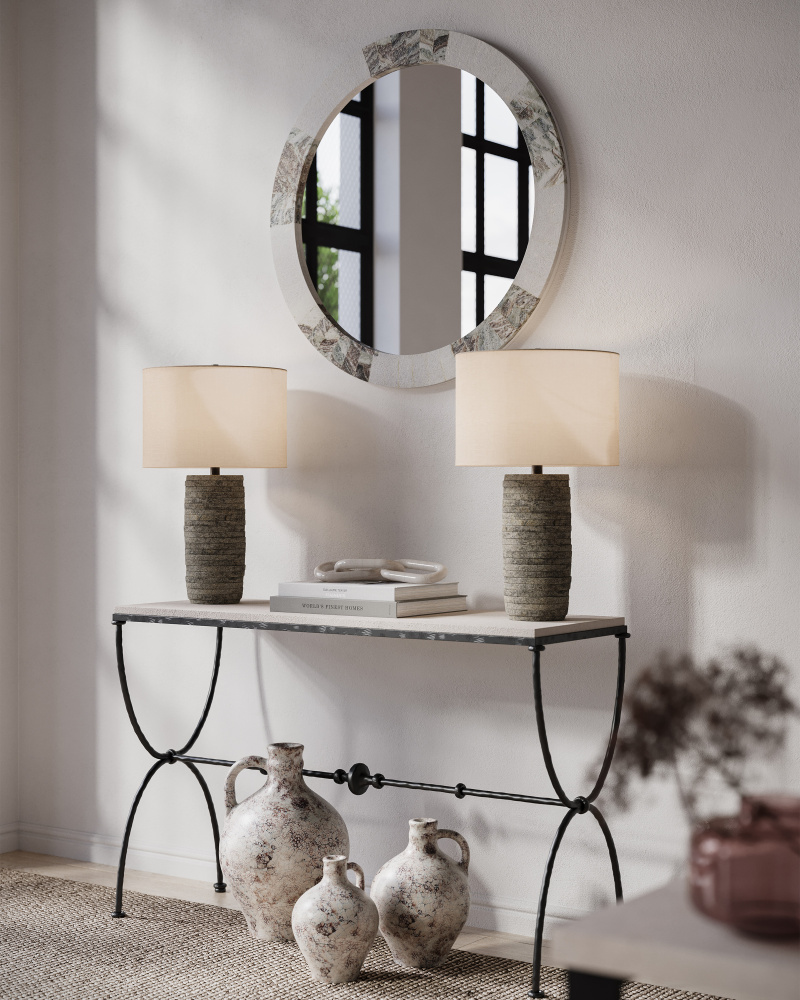 Who knew that flat discs of terracotta encircling a wrought iron spine could create a lamp with such raw natural appeal? Currey & Company’s designers, of course! They topped the sturdy Innkeeper Table Lamp with a vanilla linen shade that is held in place by a terracotta finial. The rustic feel of this natural material with its subtle variations in color and texture ensure that no two lamps are exactly alike.