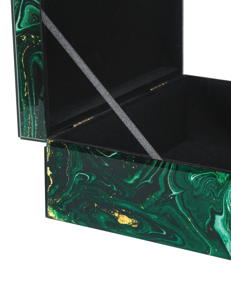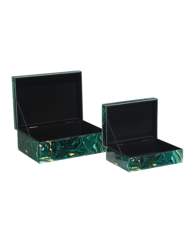 Despite looking like they are made of stone, the Interstellar Green Box Set's surfaces are the result of green swirl paper being encased in glass. The coating brings the exteriors of the decorative boxes an unparalleled sheen. The interiors are covered in black felt, and the small one will nest into the large one. Because these accessories are handmade, the patterns will vary.