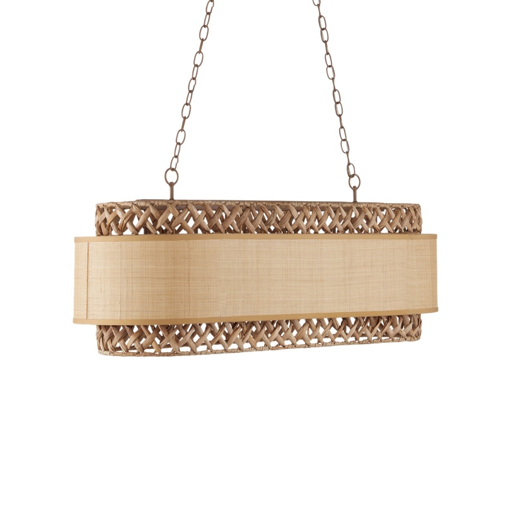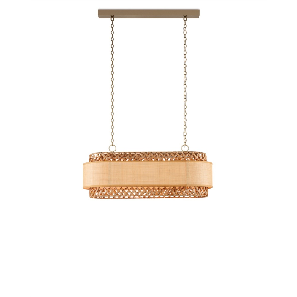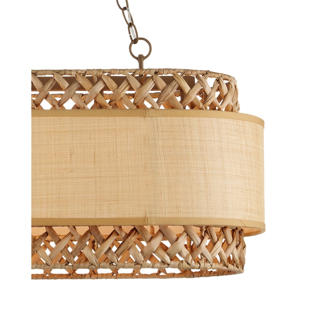 The natural material story continues with the Isola Chandelier with its wrought iron frame in a khaki finish and mix of natural water hyacinth and grasscloth fabric. The smaller, taller oval that encircles the light has a rough luxe weave of the water hyacinth; while the wider, shorter oval has a tighter weave that juxtaposes the looser crosshatching on this tan chandelier. A design detail of note is that the seams match up when the outer shade transitions from straight to curved. Adjustable from 34" to 100" with use of included chain/rod kit/cable. If your space calls for a longer drop, additional chain/rods/cable is available for purchase.