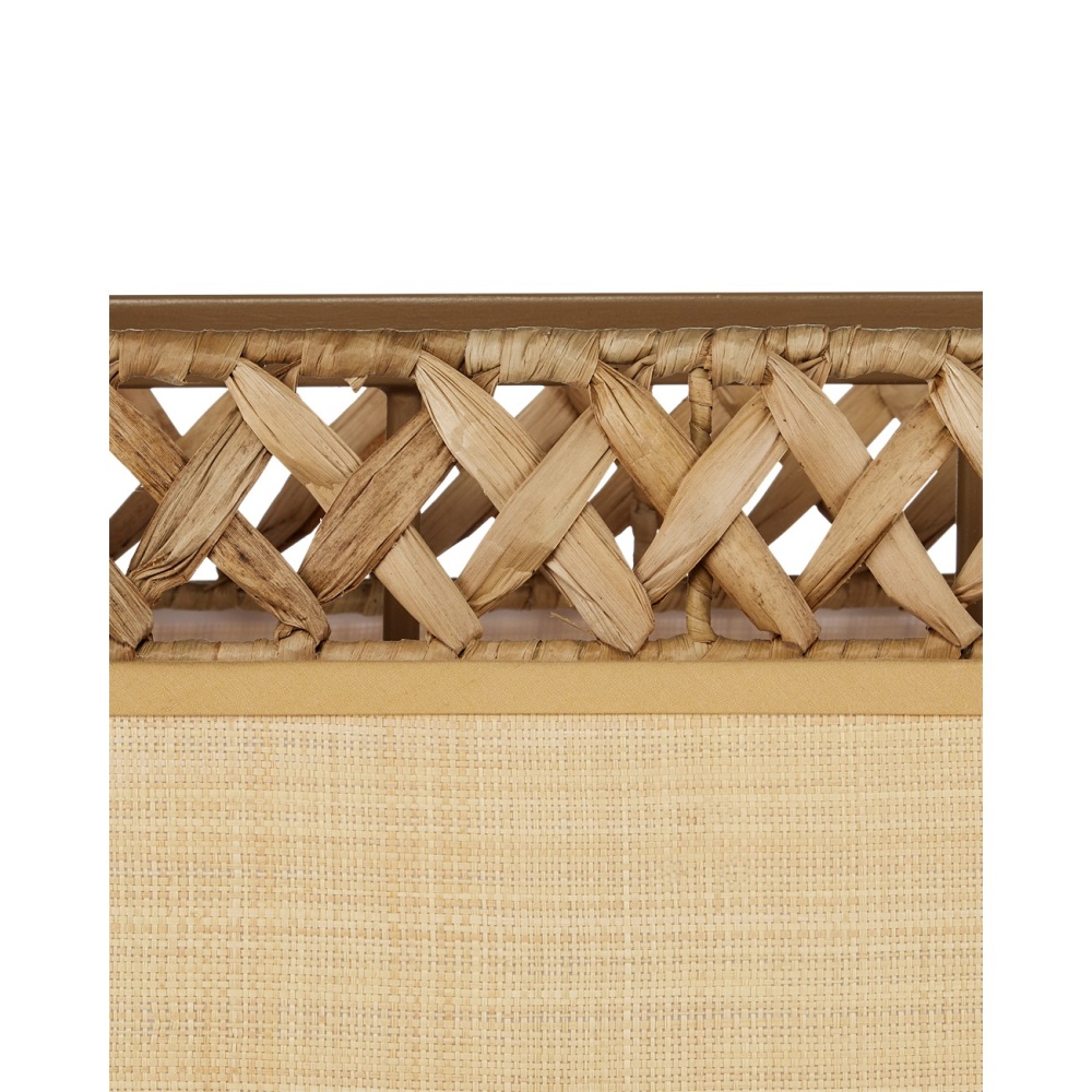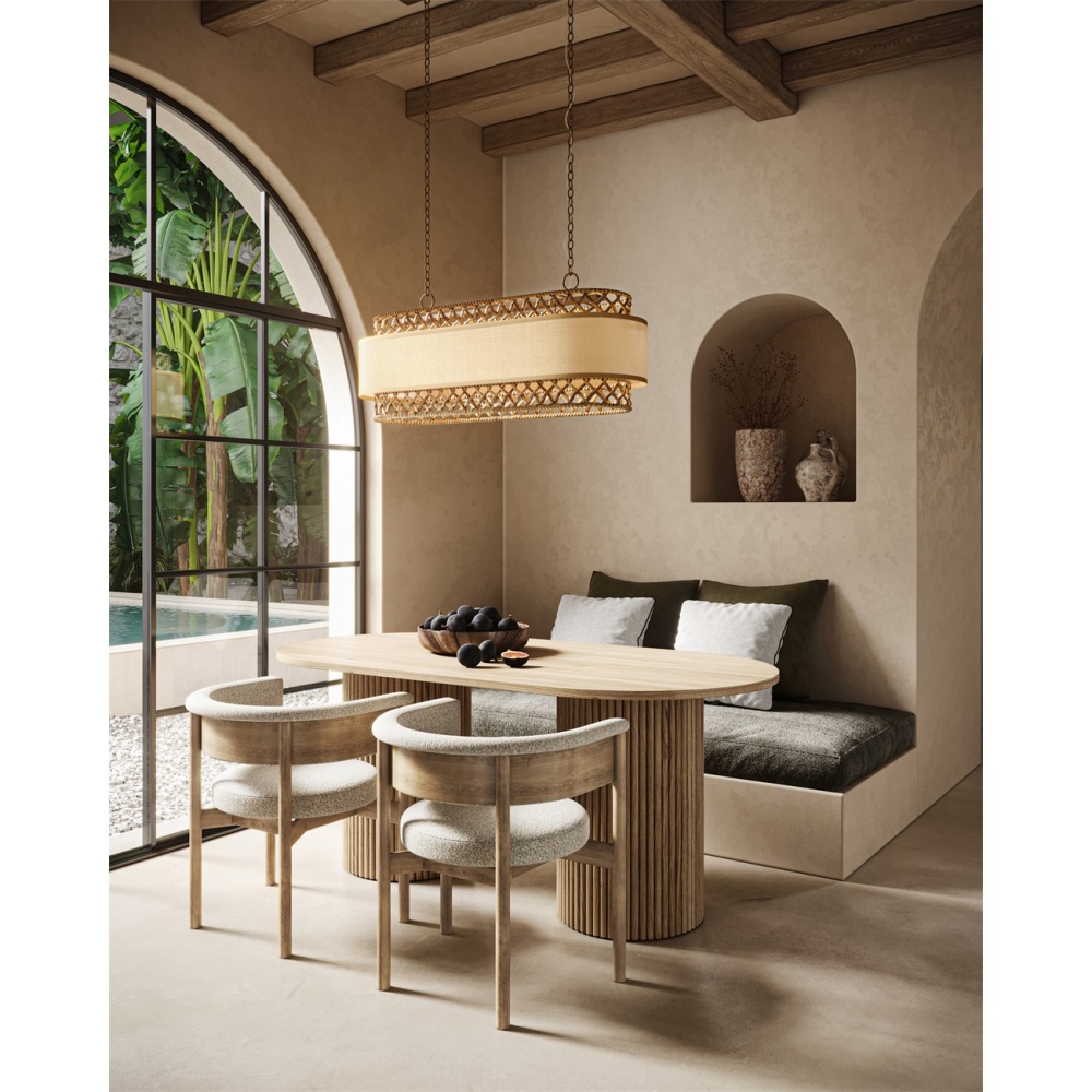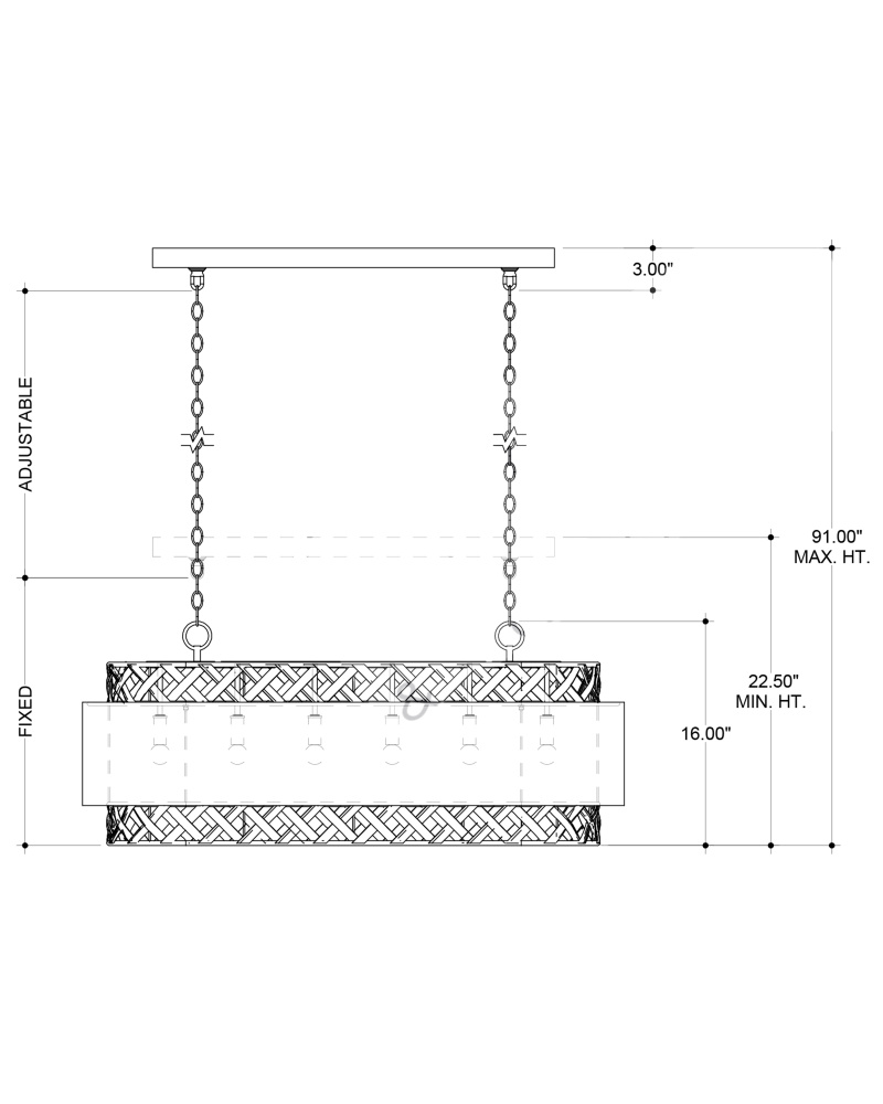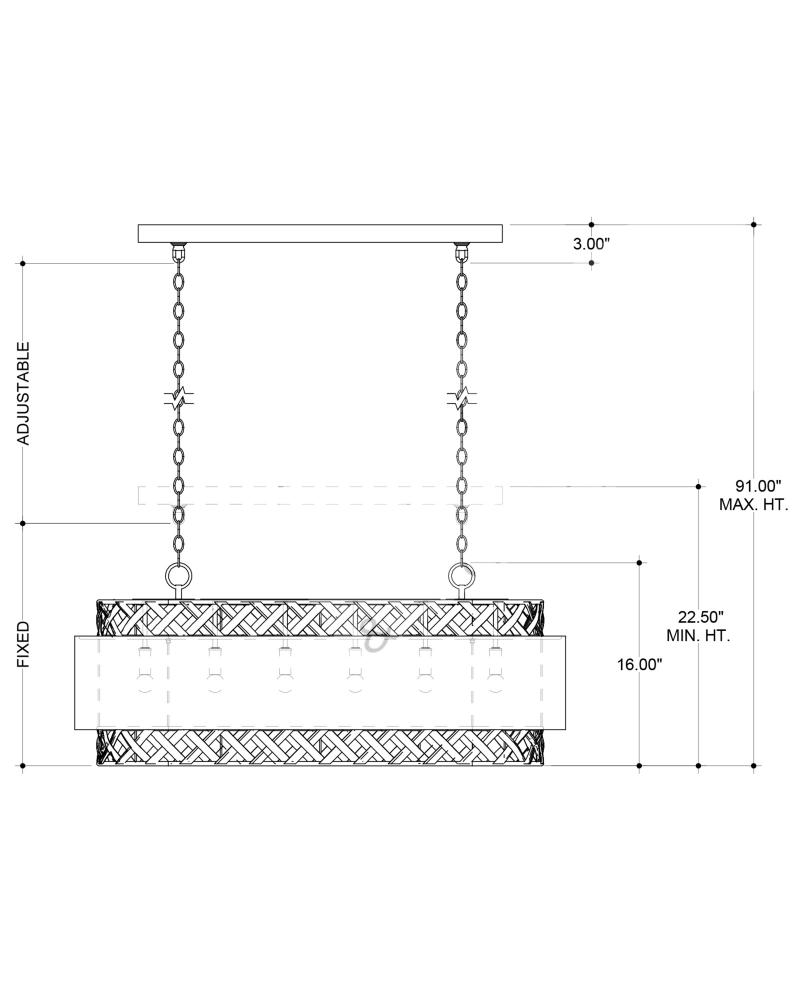 The natural material story continues with the Isola Chandelier with its wrought iron frame in a khaki finish and mix of natural water hyacinth and grasscloth fabric. The smaller, taller oval that encircles the light has a rough luxe weave of the water hyacinth; while the wider, shorter oval has a tighter weave that juxtaposes the looser crosshatching on this tan chandelier. A design detail of note is that the seams match up when the outer shade transitions from straight to curved. Adjustable from 34" to 100" with use of included chain/rod kit/cable. If your space calls for a longer drop, additional chain/rods/cable is available for purchase.