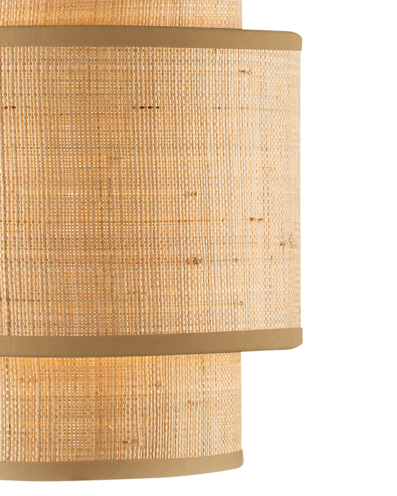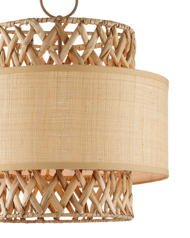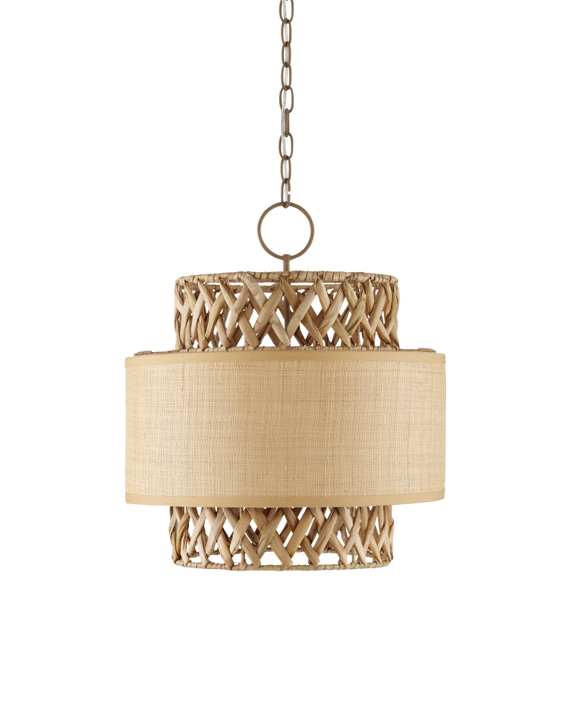 The natural material story continues with the Isola Pendant with its wrought iron frame in a khaki finish and mix of natural water hyacinth and grasscloth fabric. The smaller, taller cylinder that encircles the light has a rough luxe weave of the water hyacinth; while the wider, shorter cylinder has a tighter weave that juxtaposes the looser crosshatching on this tan pendant. Both the interior and exterior of the inner geometric form are finely finished to create a refined and sophisticated product. Adjustable from 25" to 99" with use of included chain/rod kit/cable. If your space calls for a longer drop, additional chain/rods/cable is available for purchase.
