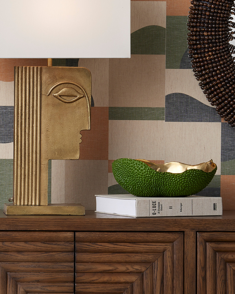 The Jackfruit decorative vessels include the Jackfruit Oval Green Bowl that is made from a lost-wax process so it reads as if it is covered in the skin of the jackfruit. The inside of each bronze bowl is a brilliant gold made of polished solid bronze, which will need to be cleaned from time to time to maintain its sheen. The green decorative vessel is watertight so it will not leak.