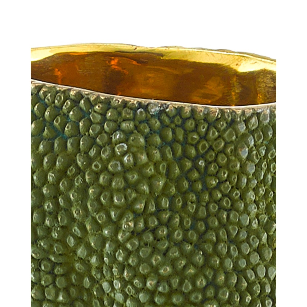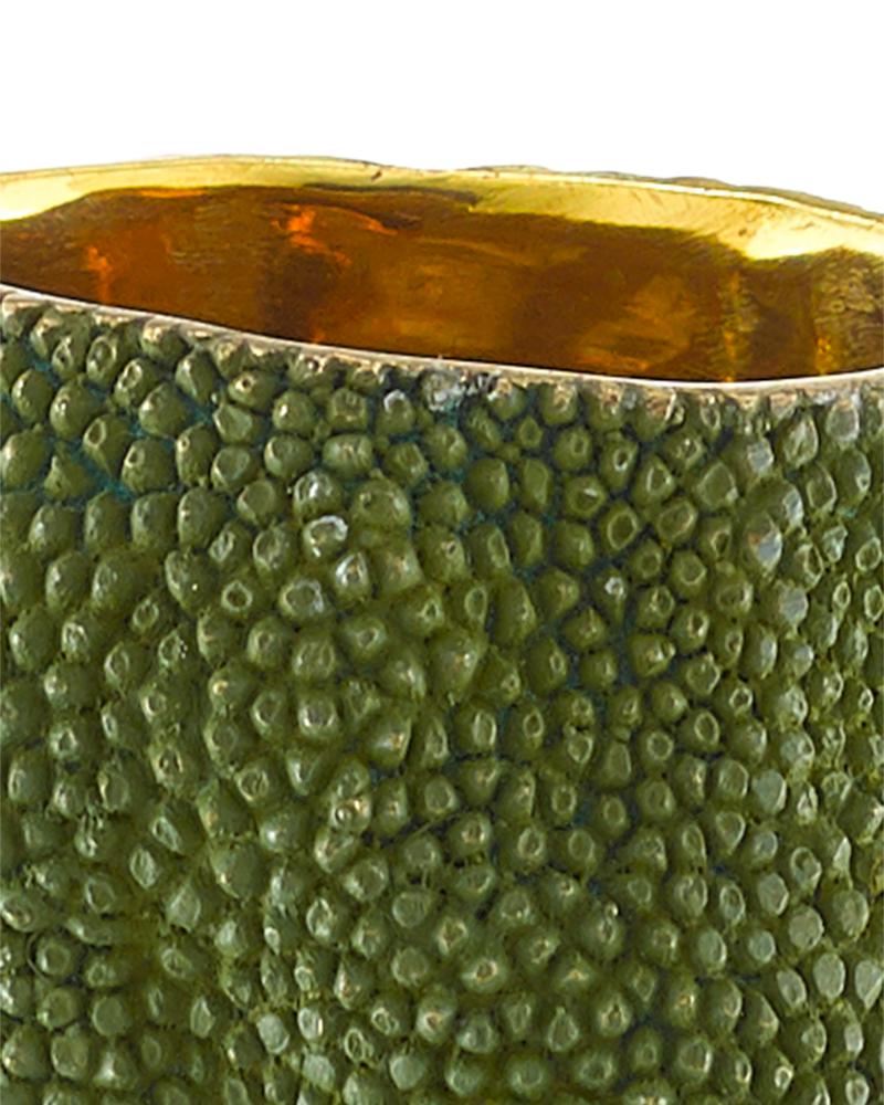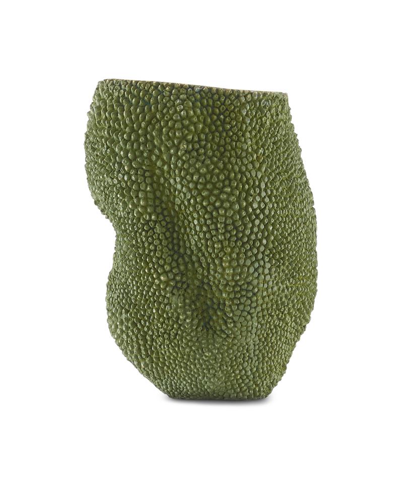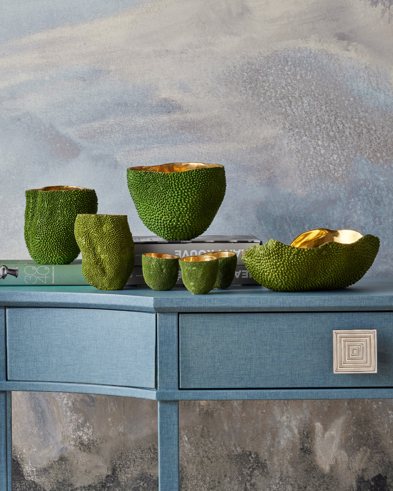 Our Jackfruit decorative vessels include the Jackfruit Small Green Vase that is made from a lost-wax process so it reads as if it is covered in the skin of the jackfruit. The inside of each bronze vase is a brilliant gold made of polished solid bronze, which will need to be cleaned from time to time to maintain its sheen. These green decorative vessels are watertight so they will not leak.