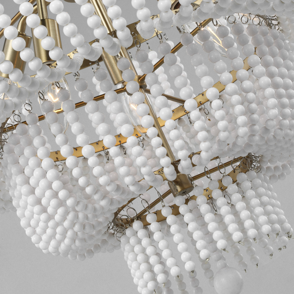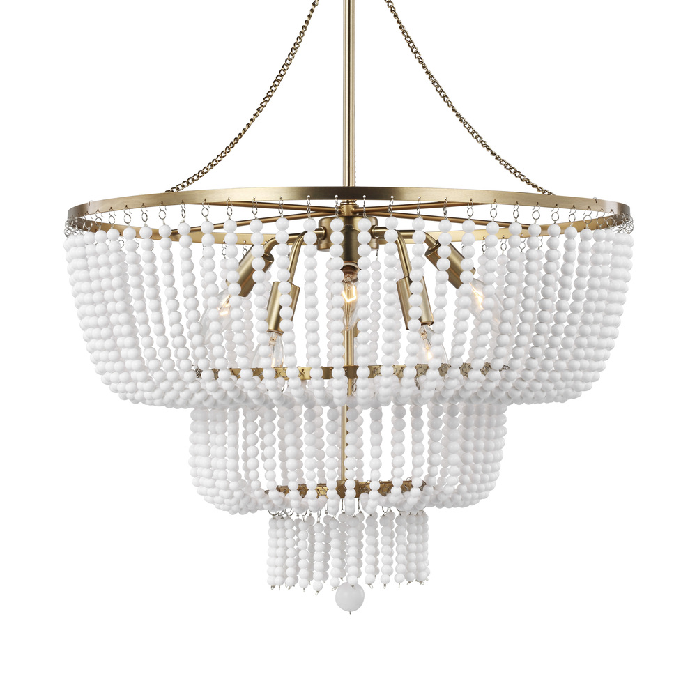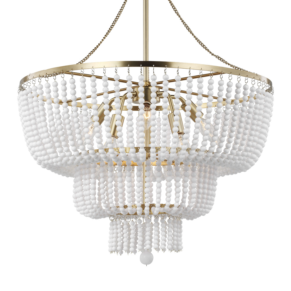 The Jackie six light single tier chandelier in satin brass provides abundant light to your home, while adding style and interest. Adding an elegant texture to any room, the Jackie three light semi-flush mount is draped in a waterfall of white beads with brass or brushed nickel framework