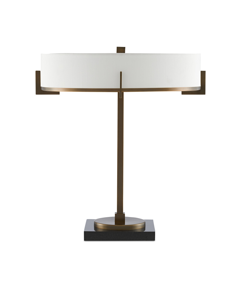 What happens when a designer takes what was essentially a time-honored profile that dates back to the days of the Industrialists and gives it a marvelously modern profile? Our Jacobi Table Lamp. With a minimal amount of metal in an antique brass finish, the design impact is vast. The thin stem rising from a black marble base is cool enough given its width is echoed by the finial, but the way the off-white shantung shade is clasped by geometric accents and the height of the shade give this design its va-va-voom.